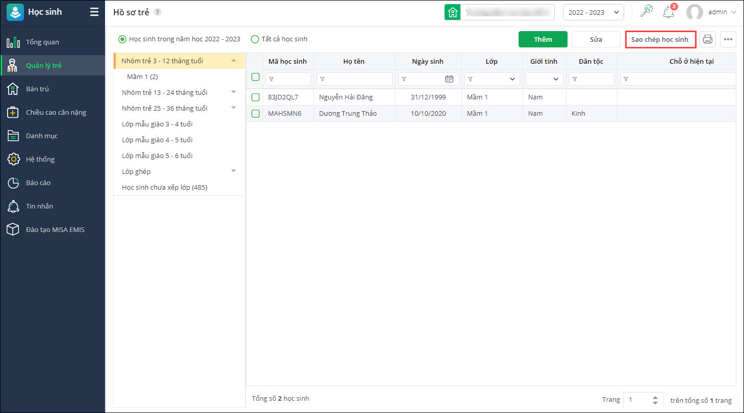 Trường hợp muốn sao chép hồ sơ học sinh từ năm học trước hoặc từ phân hệ Khoản thu (Đối với những trường sử dụng song song phân hệ Học sinh và Khoản thu), anh/chị thực hiện như sau:- Chọn Sao chép học sinh.