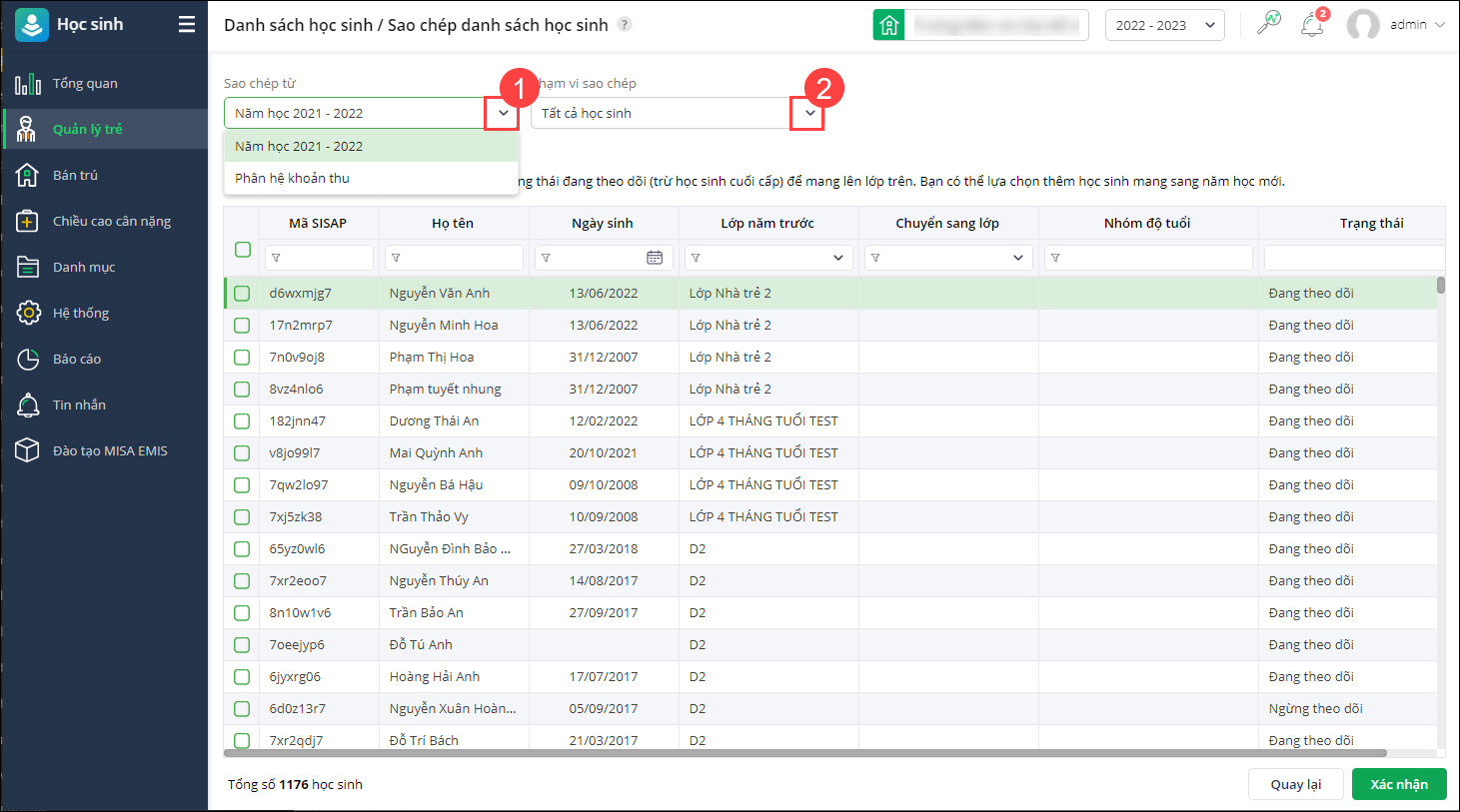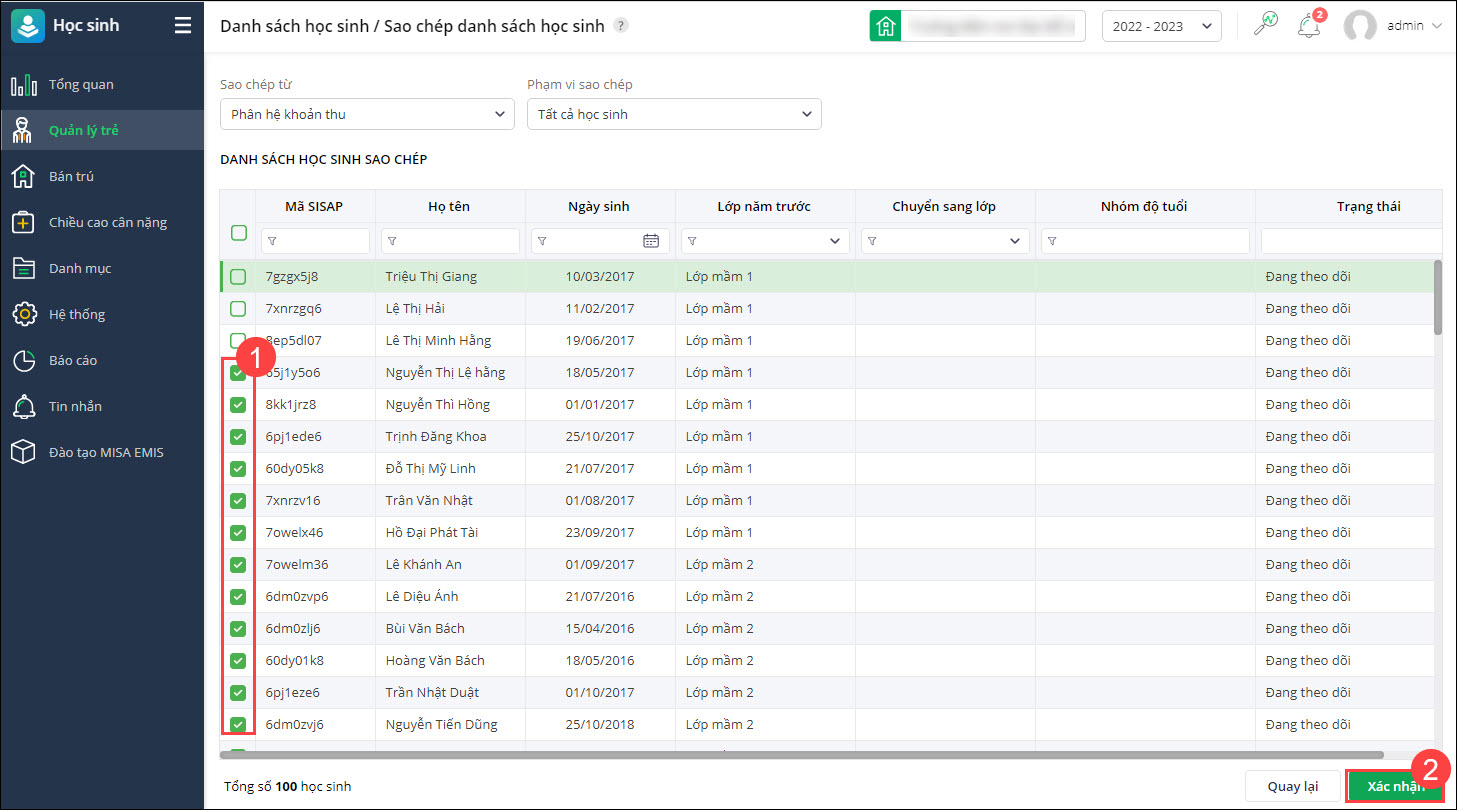 - Chọn sao chép từ năm học trước hoặc từ phân hệ Khoản thu. Chọn phạm vi muốn lấy lên danh sách học sinh.