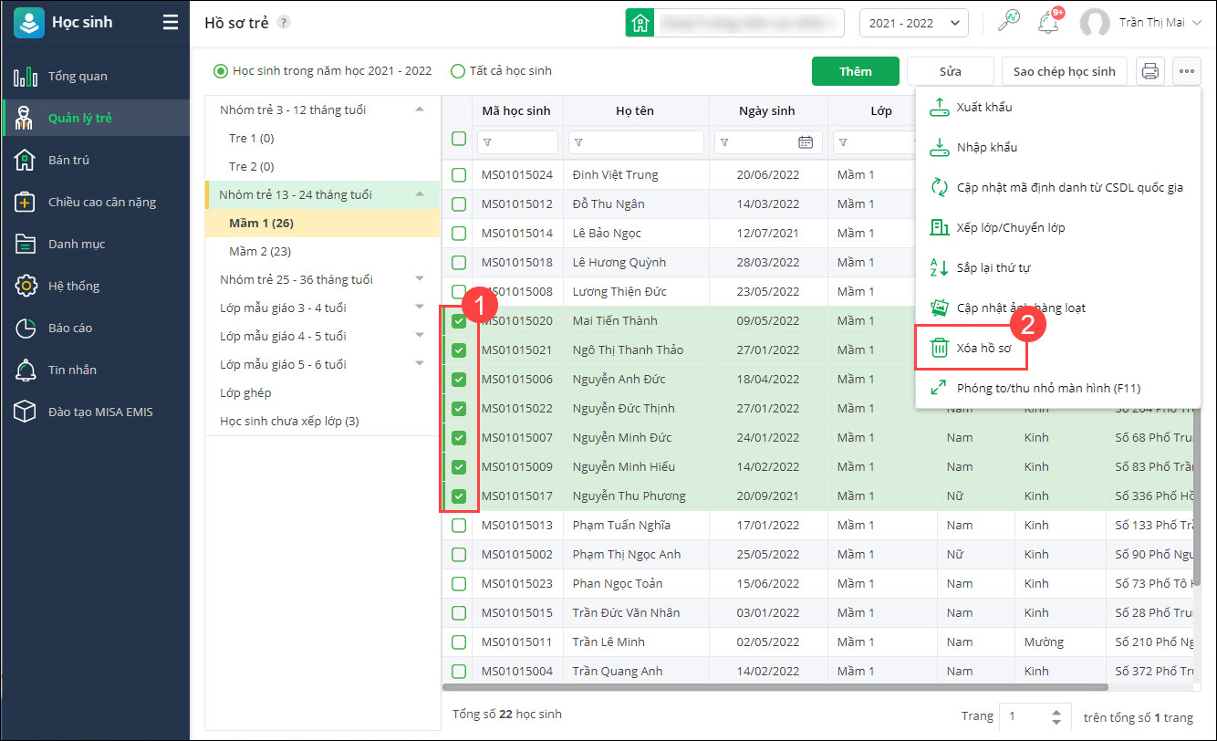 - Tích chọn hồ sơ trẻ cần xóa, chọn Xóa hồ sơ.