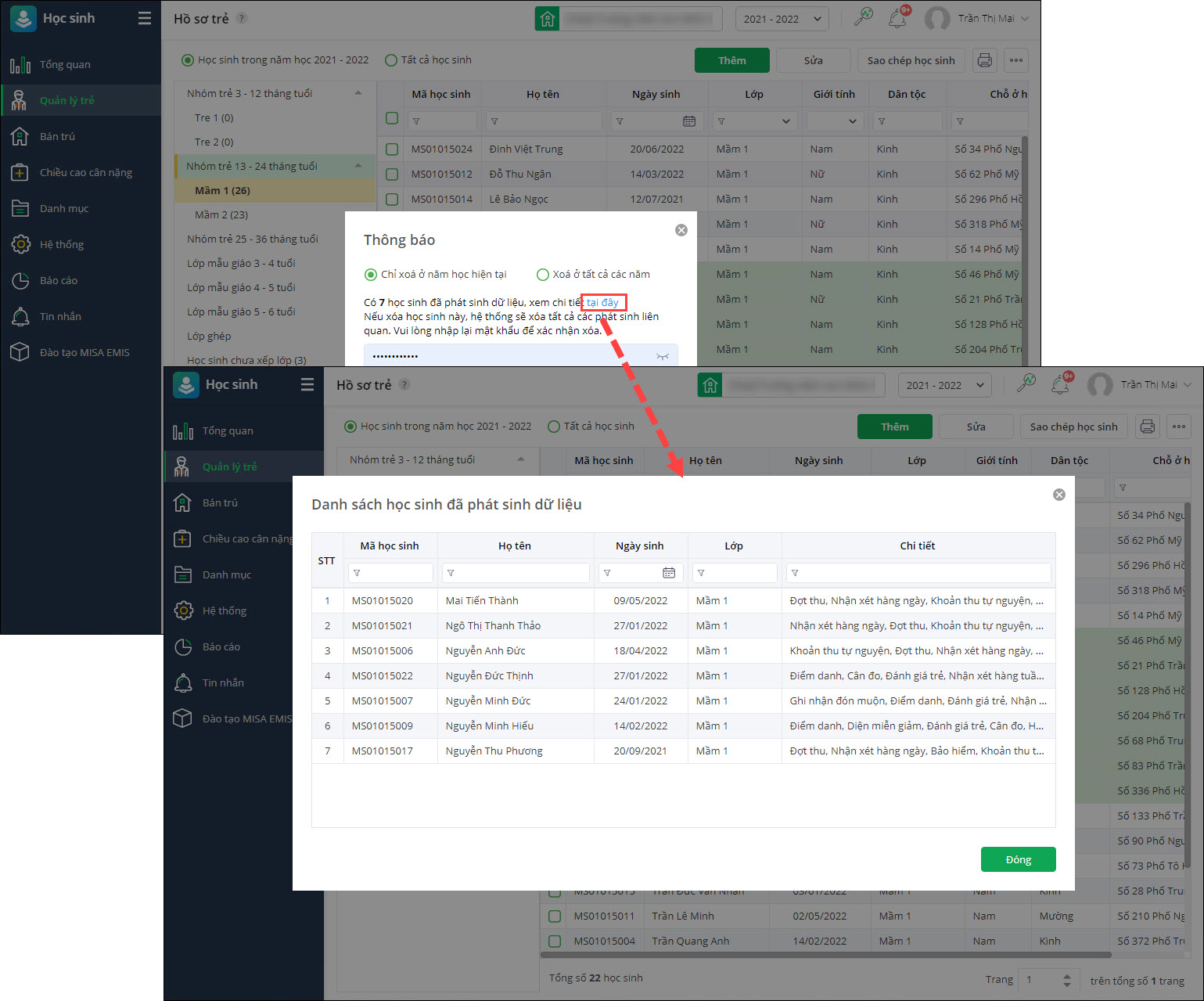 - Nếu học sinh đã phát sinh dữ liệu, chọn tại đây để xem thông tin chi tiết phạm vi dữ liệu ảnh hưởng.