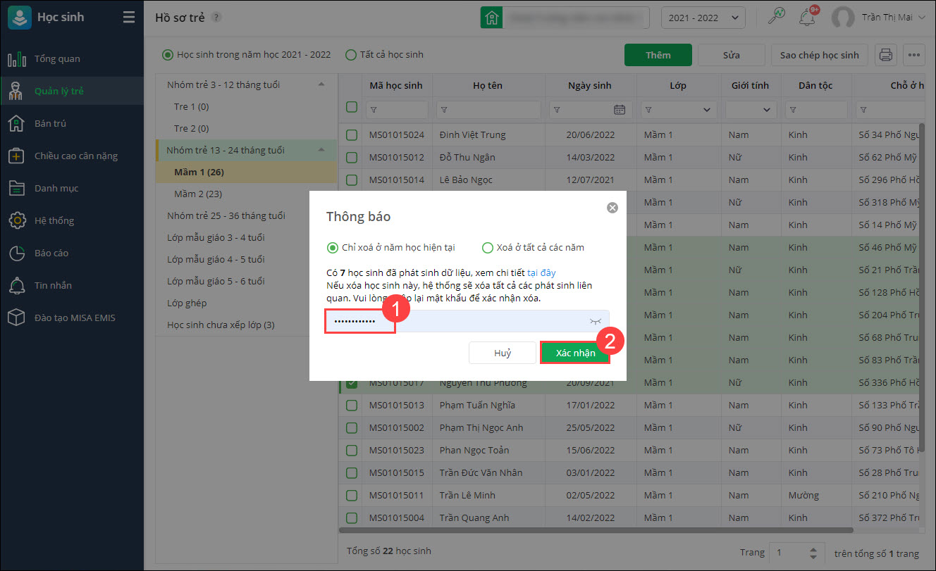 - Nếu học sinh chưa phát sinh dữ liệu, anh/chị chọn Xóa.