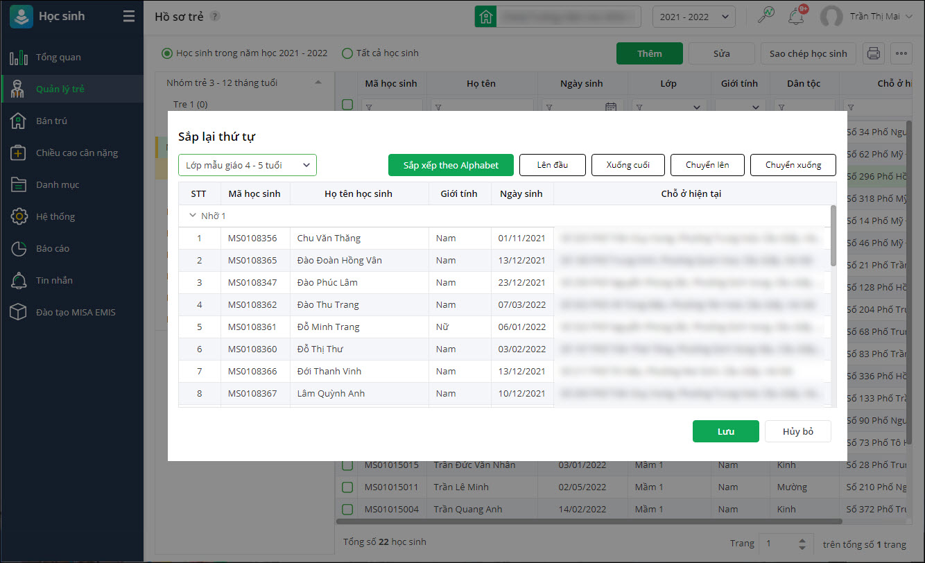 - Lựa chọn lớp cần sắp xếp lại thứ tự sau đó lựa chọn học sinh cần sắp lại thứ tự.
