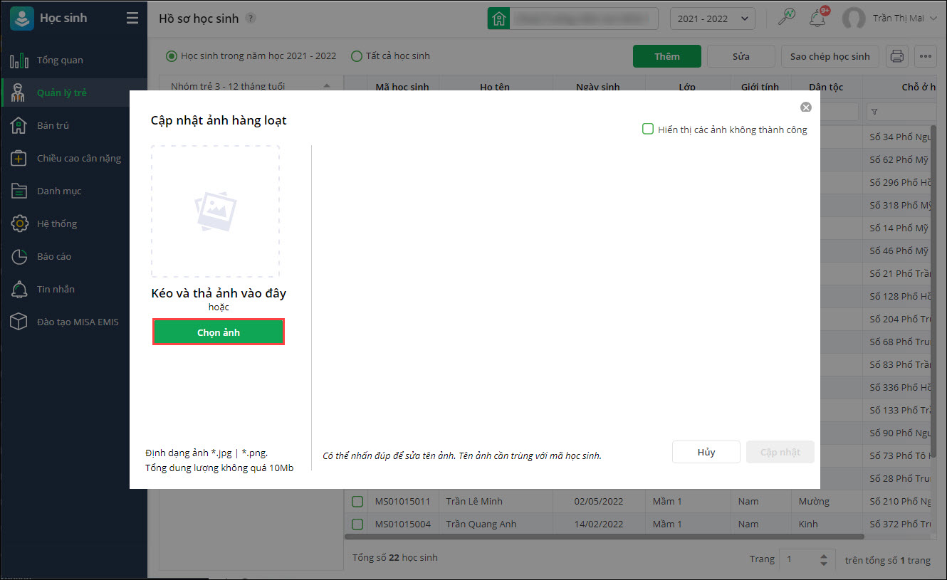 Lưu ý: Để có thể cập nhật ảnh hàng loạt, anh/chị giữ phím Ctrl và lựa chọn các ảnh cần cập nhật. - Tên ảnh cần trùng với mã học sinh, anh/chị chỉnh sửa bằng cách nhấn đúp chuột.