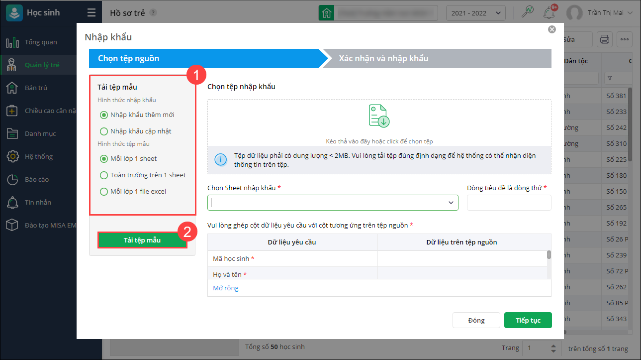 - Hình thức nhập khẩu: Nhập khẩu thêm mới để thêm mới học sinh vào danh sách hoặc Nhập khẩu cập nhật để bổ sung thông tin vào danh sách học sinh đã có trên phần mềm.