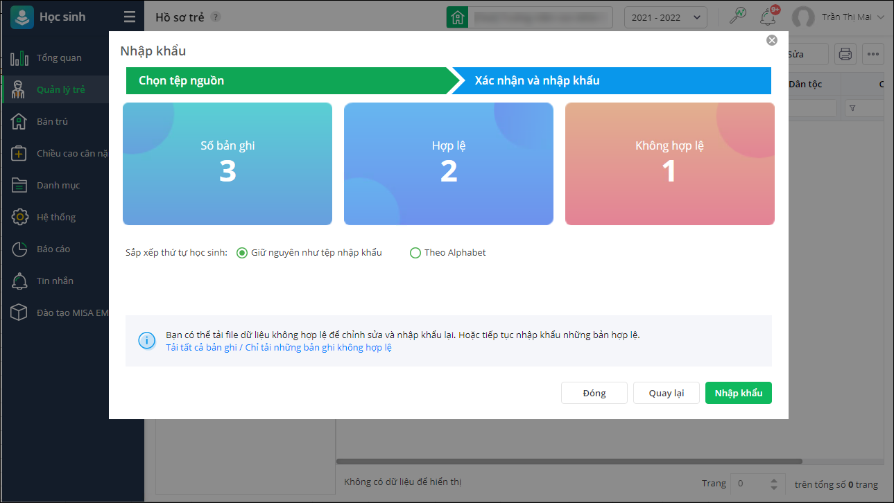 - Đối với bản ghi Hợp lệ: Anh/chị lựa chọn sắp xếp thư tự học sinh theo Alphabet hoặc giữa nguyên như tệp nhập khẩu. Chọn Nhập khẩu để nhập khẩu bản ghi hợp lệ vào phần mềm.