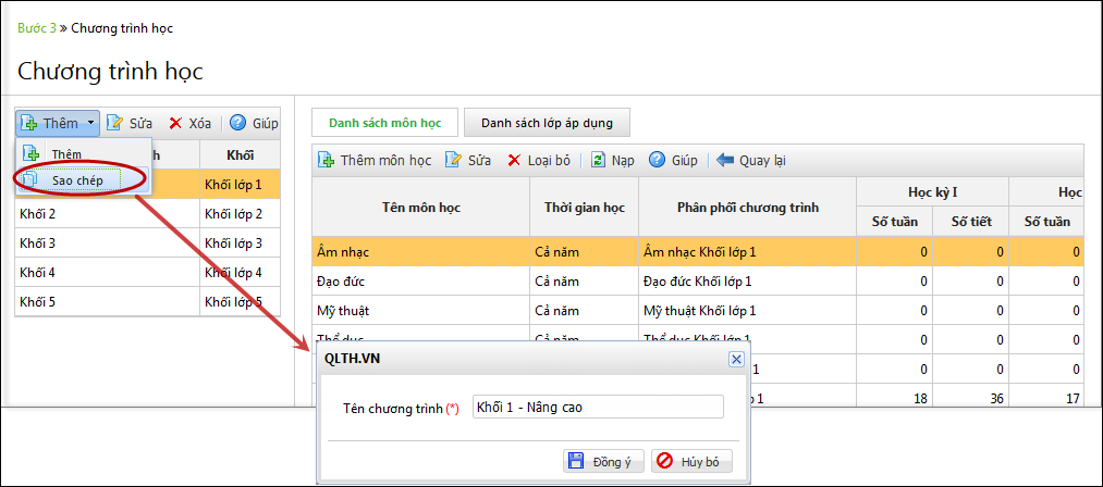 5. Chọn chương trình học trên danh sách, sau đó nhấn Thêm\Sao chép.