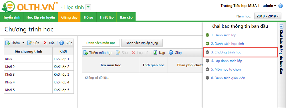 Hệ thống đã mặc định sẵn chương trình học dựa vào thông tin Cấp trường tương ứng. Tuy nhiên, anh/chị vẫn có thể sửa lại chương trình học theo nhu cầu giảng dạy tại trường hoặc thực hiện thêm chương trình học mới theo một trong các cách sau: