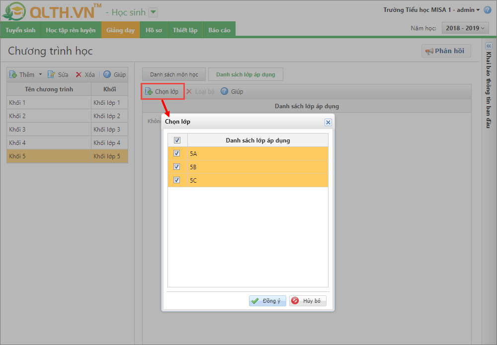 4. Chọn lớp áp dụng chương trình học mới:
