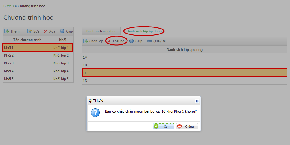 2. Có thể bỏ bớt môn học không phù hợp với chương trình học đang có, bằng cách chọn môn học và nhấn Loại bỏ.