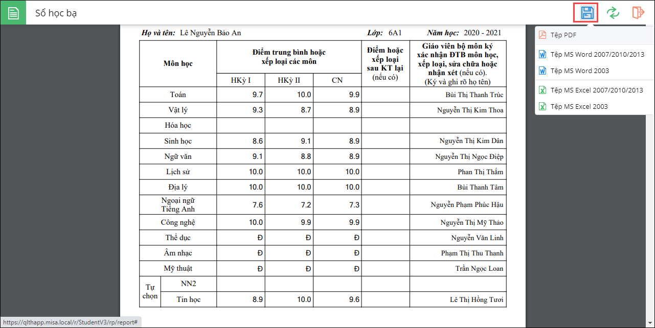 - Nhấn Đồng ý, nhấn vào biểu tượng này để xuất sổ học bạ ra định dạng excel, word,..