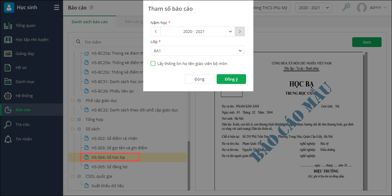 - Nhấp đôi chuột hoặc nhấn Xem để in Sổ học bạ