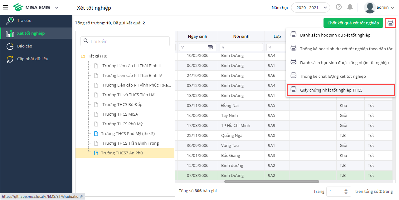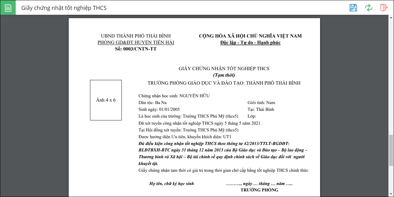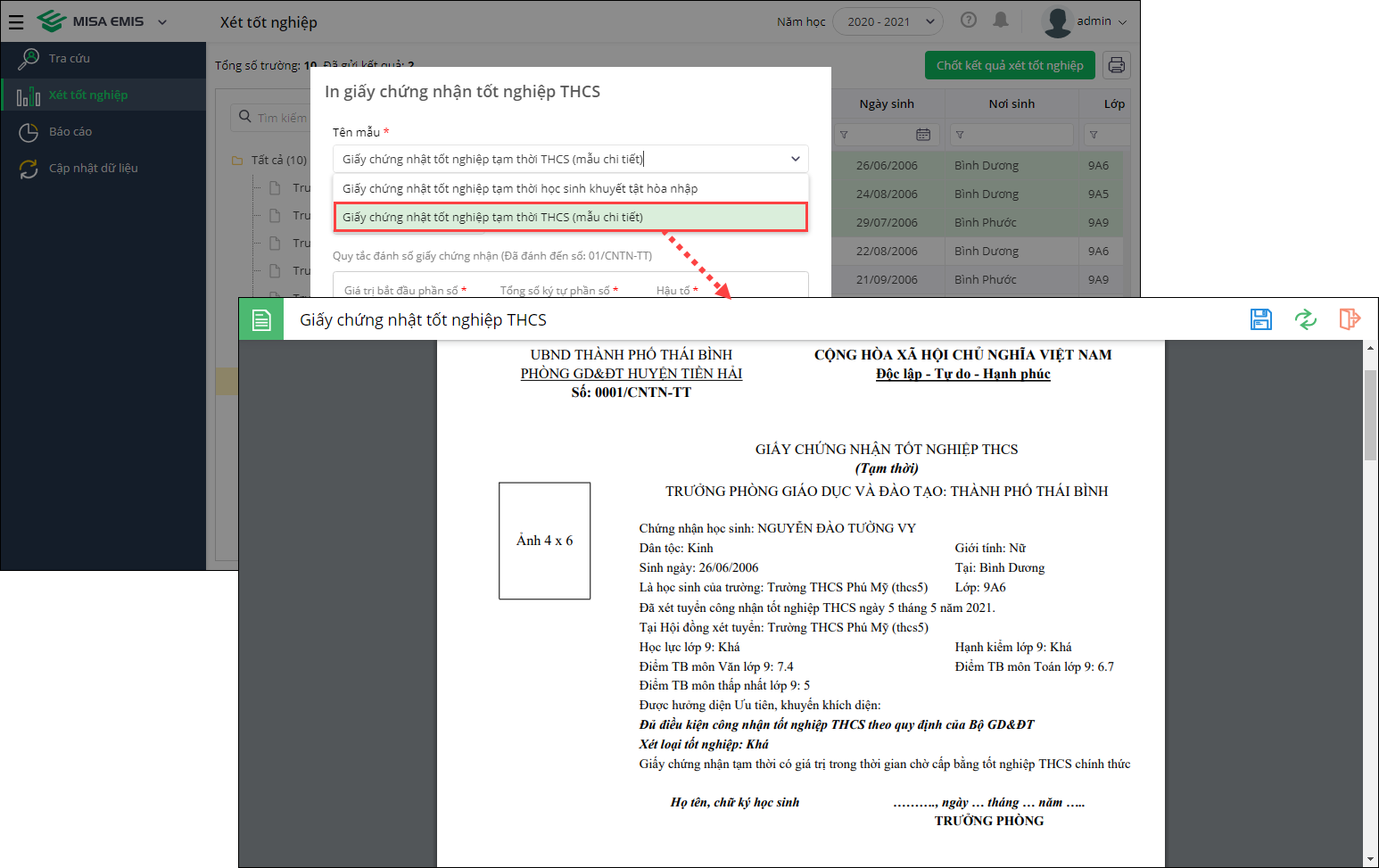 - Nhấn biểu tượng máy in, chọn Giấy chứng nhận tốt nghiệp THCS
