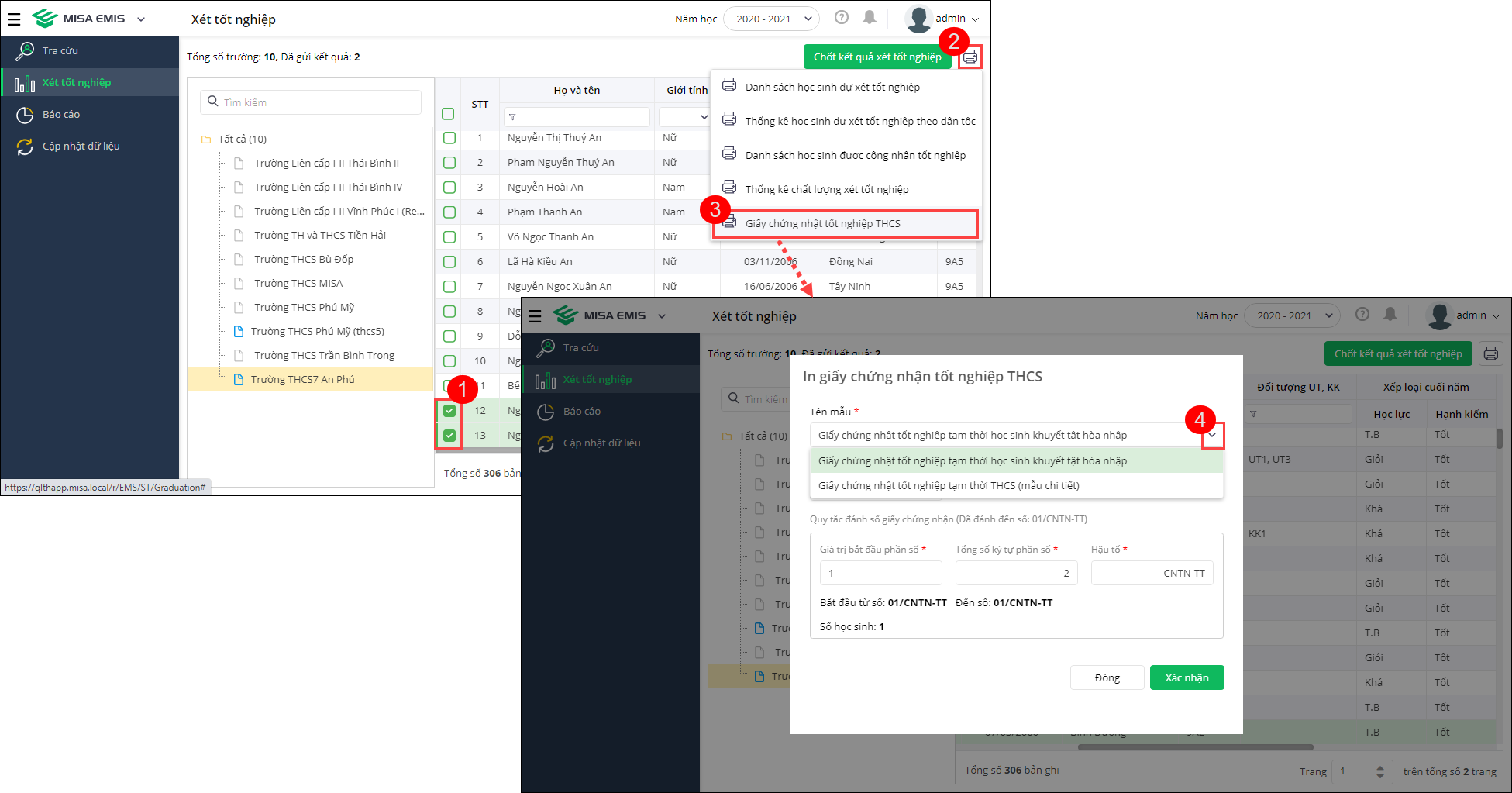 - Nhấn biểu tượng máy in, chọn Giấy chứng nhận tốt nghiệp THCS