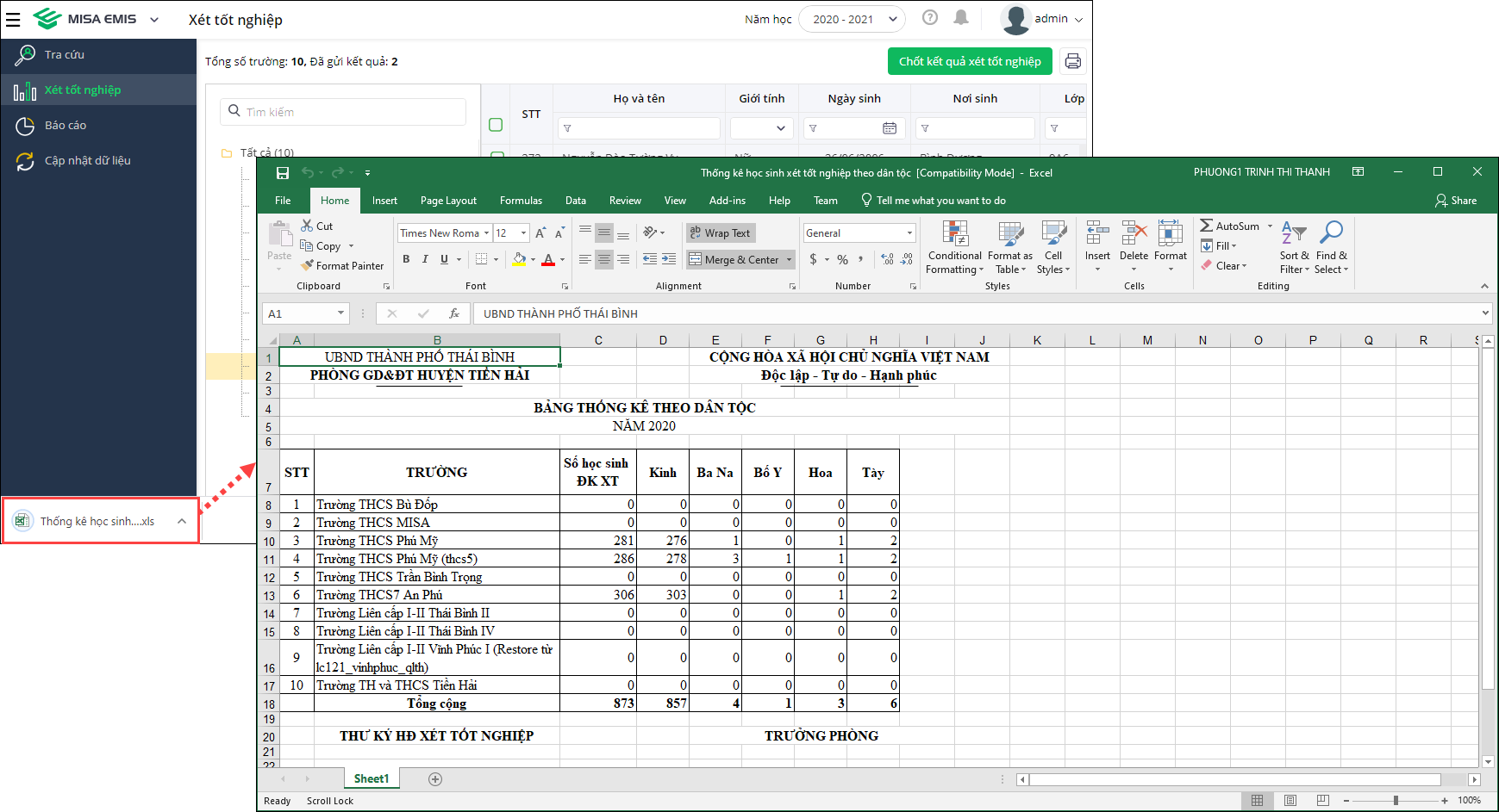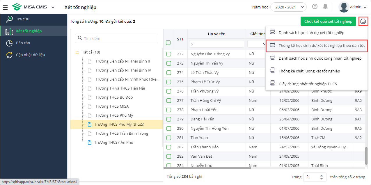 - Nhấn biểu tượng máy in, chọn Thống kê học sinh dự xét tốt nghiệp theo dân tộc