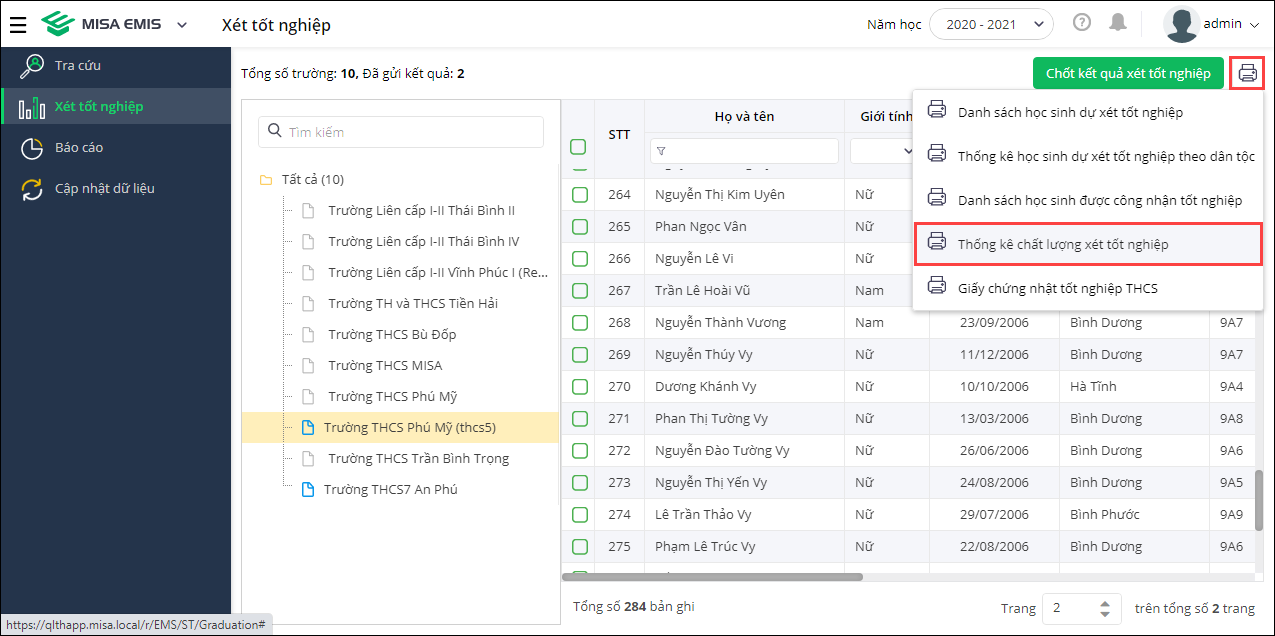 - Nhấn biểu tượng máy in, chọn Thống kê chất lượng xét tốt nghiệp