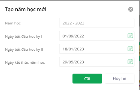 Trường hợp dữ liệu năm học cũ là dữ liệu nháp/tập huấn, anh/chị nhấn Khởi tạo mới/Khai báo thời gian năm học. Nhấn Cất.