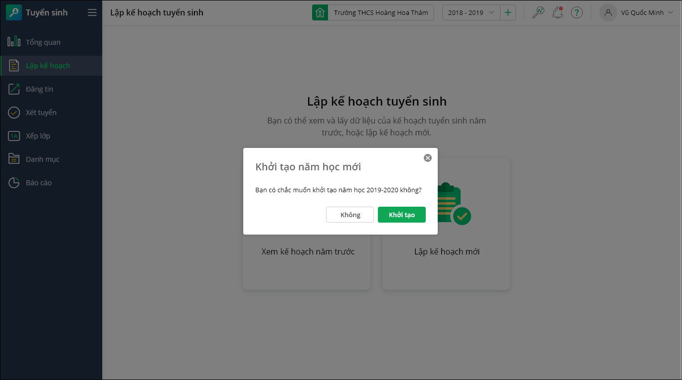 - Chọn Khởi tạo để tiếp tục khởi tạo năm học mới cho phân hệ Tuyển sinh.