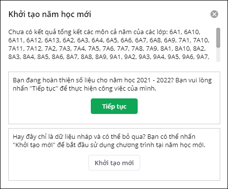 - Trường hợp đơn vị đã hoàn thành tổng kết năm học, anh/chị chọn khởi tạo năm học bằng 1 trong 2 cách sau: