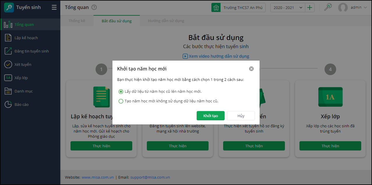 - Vào Tuyển sinh, nhấn vào đây để Khởi tạo năm học mới