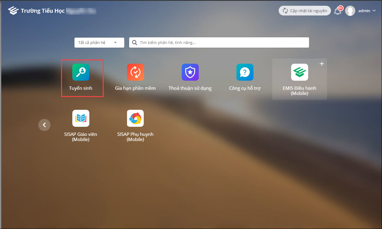 - Sau khi đăng nhập thành công, chọn vào phân hệ Tuyển sinh.
