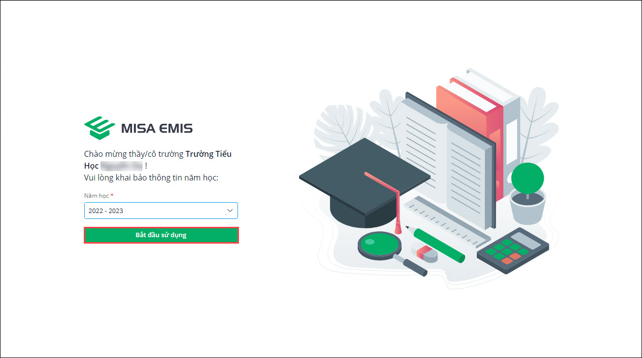 - Phần mềm lấy lên năm học hiện tại để nhà trường nhấn Bắt đầu sử dụng luôn. Trường hợp muốn chọn năm học khác, anh/chị nhấn vào dấu mũi tên để chọn lại năm học.