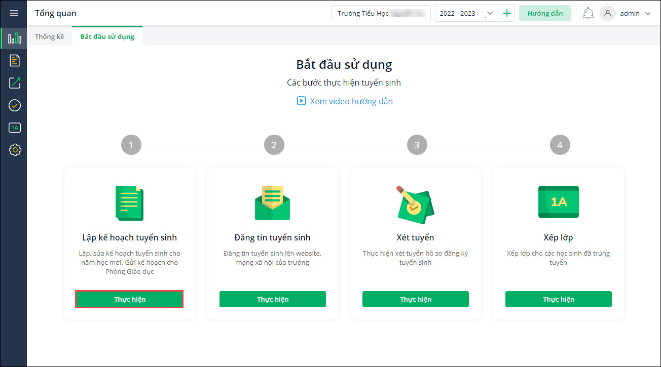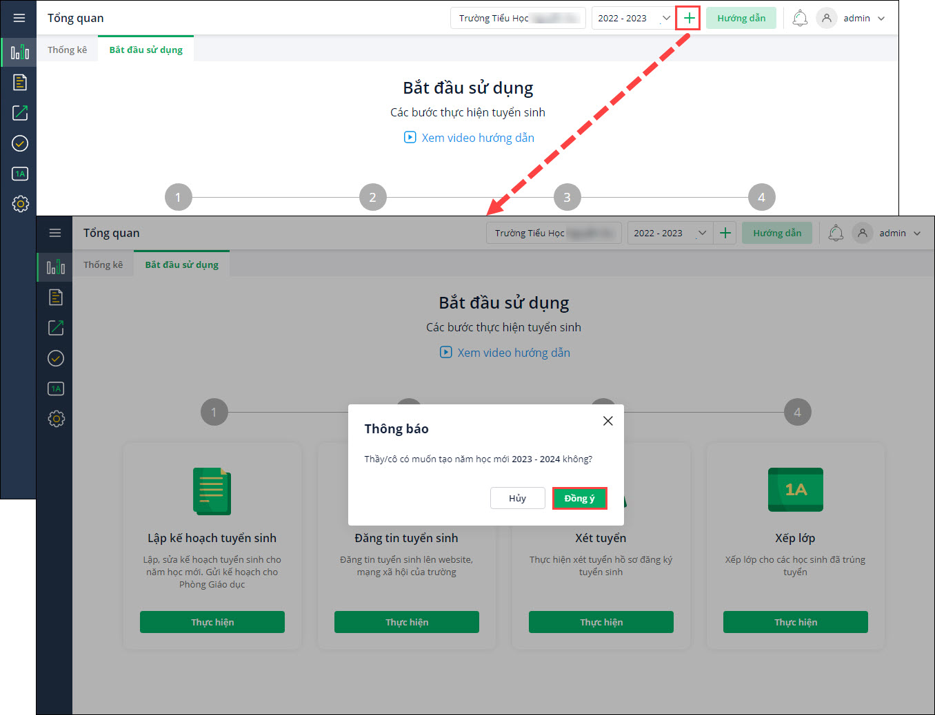 - Sau khi khởi tạo năm học thành công, anh/chị có thể bắt đầu sử dụng phần mềm và Thực hiện Lập kế hoạch tuyển sinh.