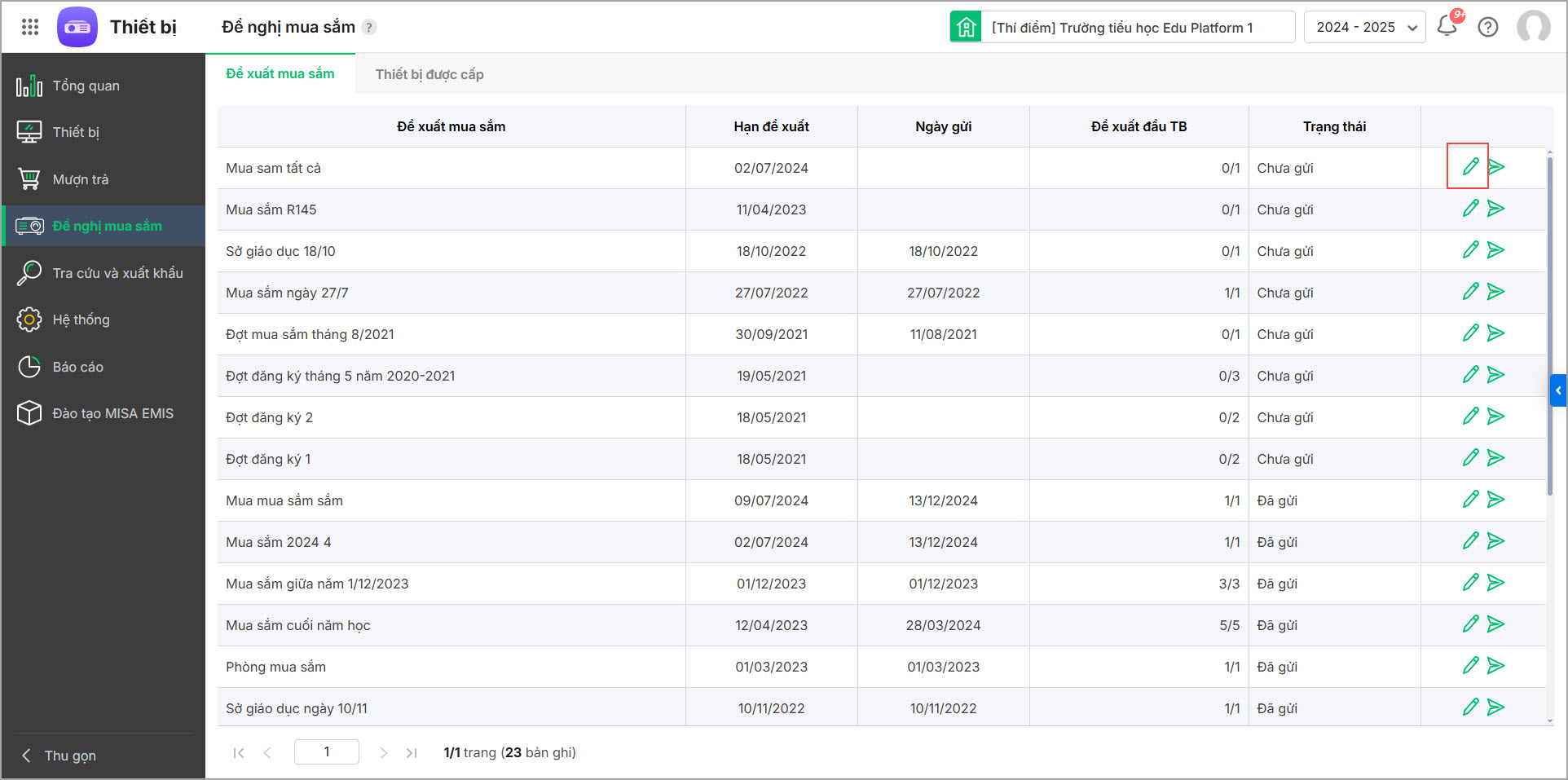 • Nhấn vào biểu tượng cây bút tại đề xuất mua sắm cần gửi. Tại đây hiển thị các thiết bị nằm trong danh mục thiết bị được của đơn vị chủ quản gửi xuống.