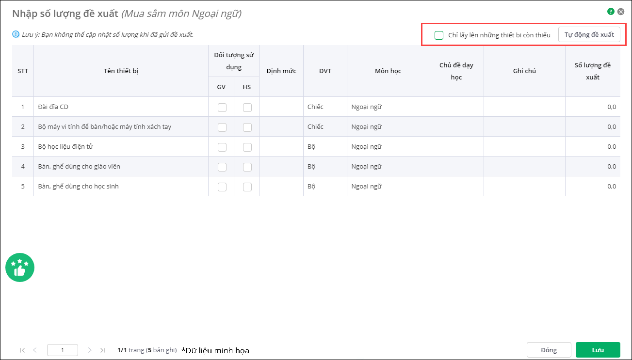 • Chọn Tự động đề xuất để tự động lấy lên số liệu mới nhất của cột Số lượng thiếu so với quy định và đẩy dữ liệu vào cột Số lượng đề xuất theo số lượng còn thiếu so với quy định.