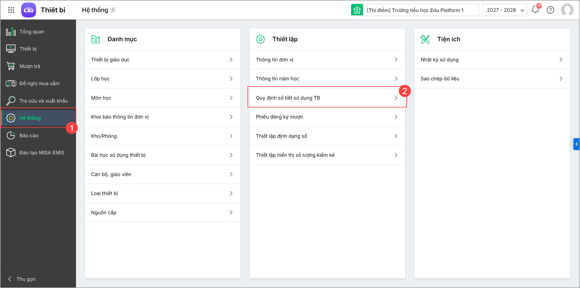 - Vào Hệ thống, chọn Quy định số tiết sử dụng TB.