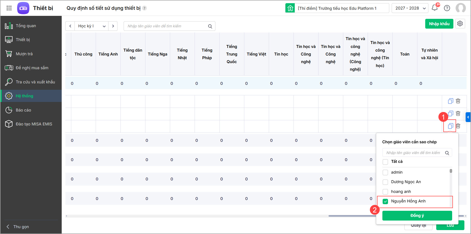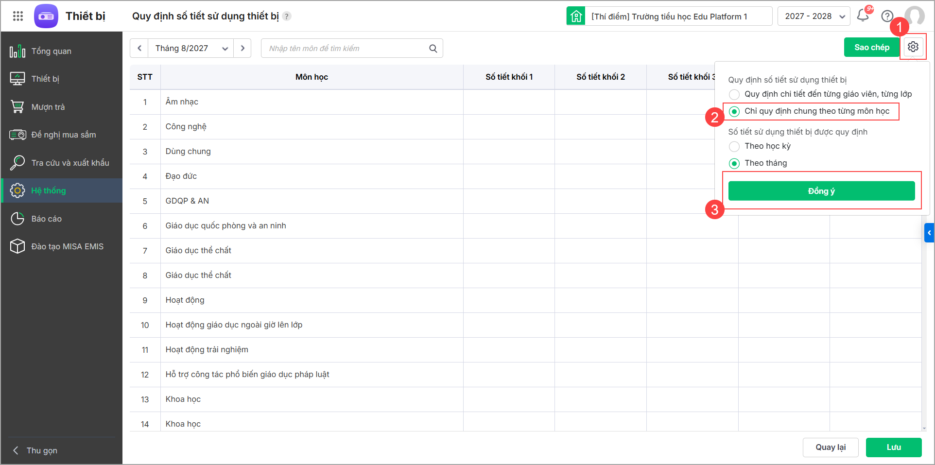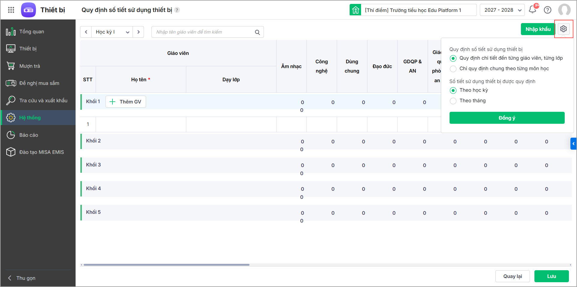 - Lựa chọn cách quản lý quy định sử dụng thiết bị chi tiết theo giáo viên hoặc theo từng môn học phù hợp với trường của mình, đồng thời quản lý theo kỳ hoặc tháng.