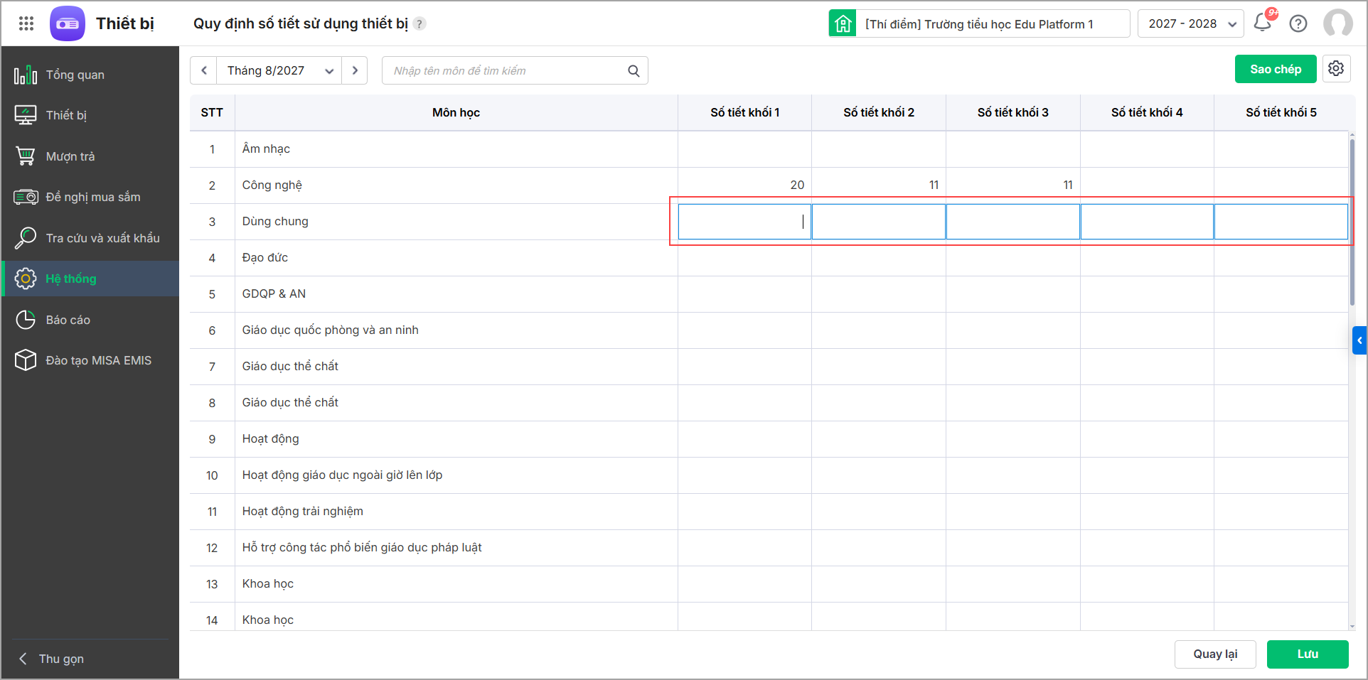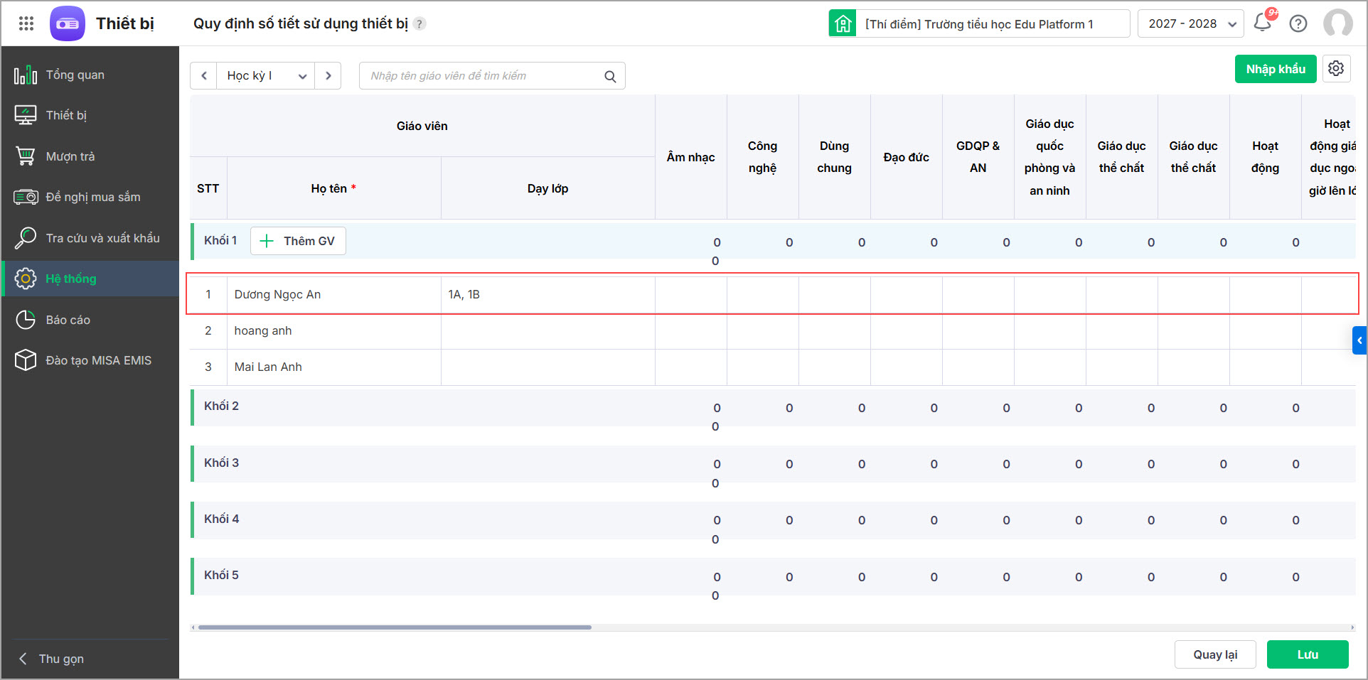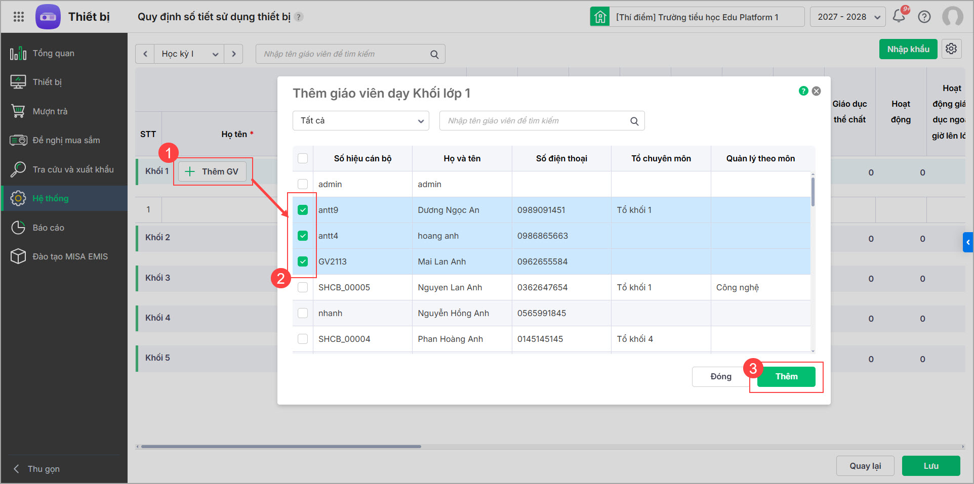 - Lựa chọn cách quản lý quy định sử dụng thiết bị chi tiết theo giáo viên hoặc theo từng môn học phù hợp với trường của mình, đồng thời quản lý theo kỳ hoặc tháng.