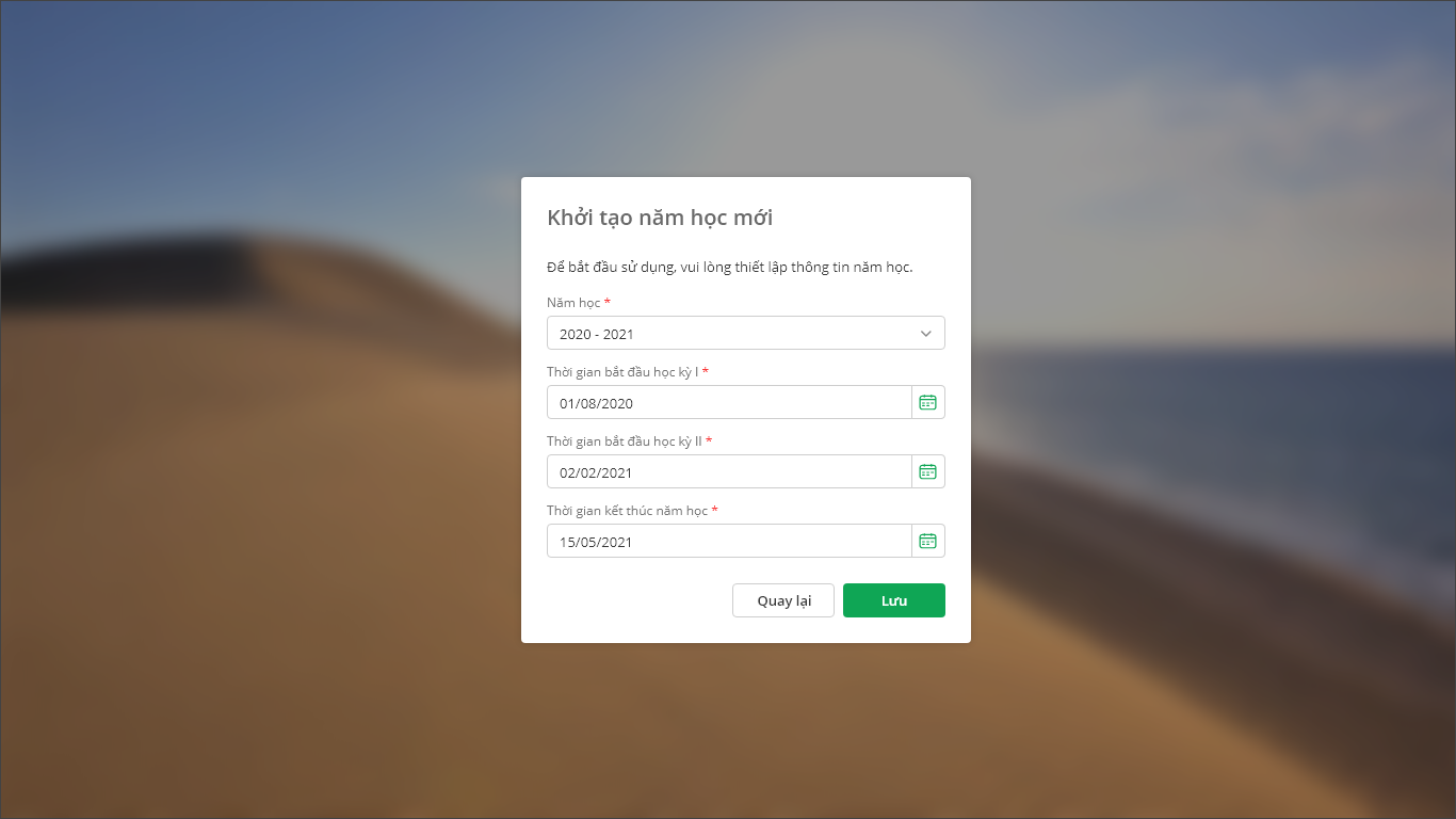 Vào Thư viện, anh/chị thực hiện khai báo thông tin năm học để bắt đầu sử dụng phần mềm.