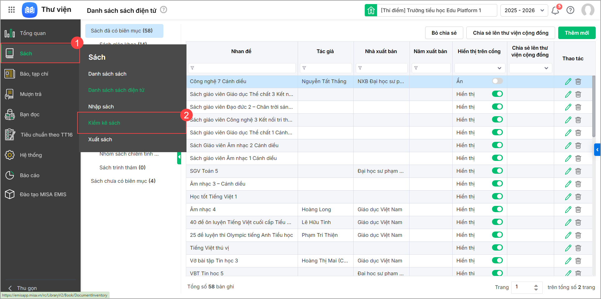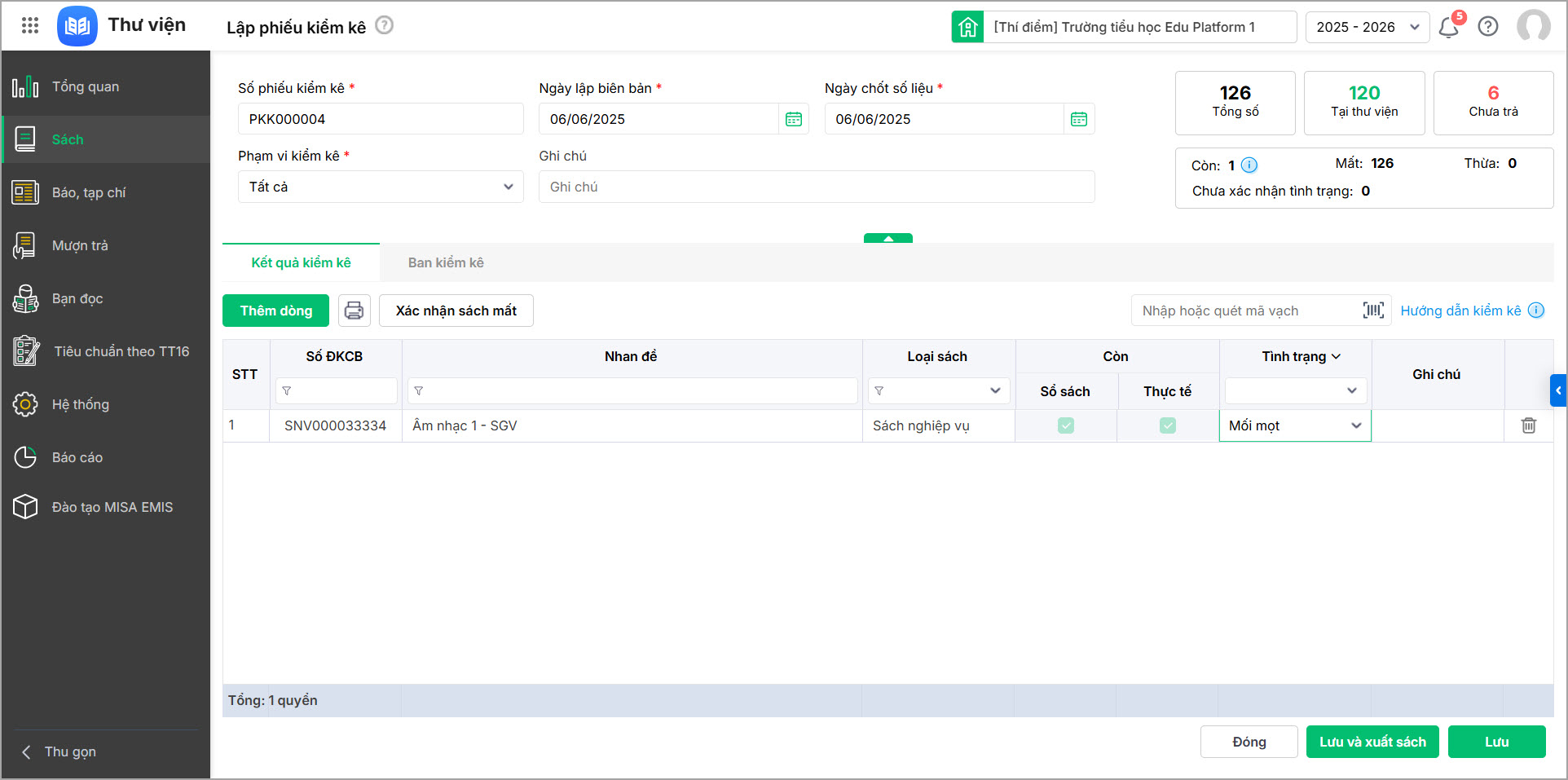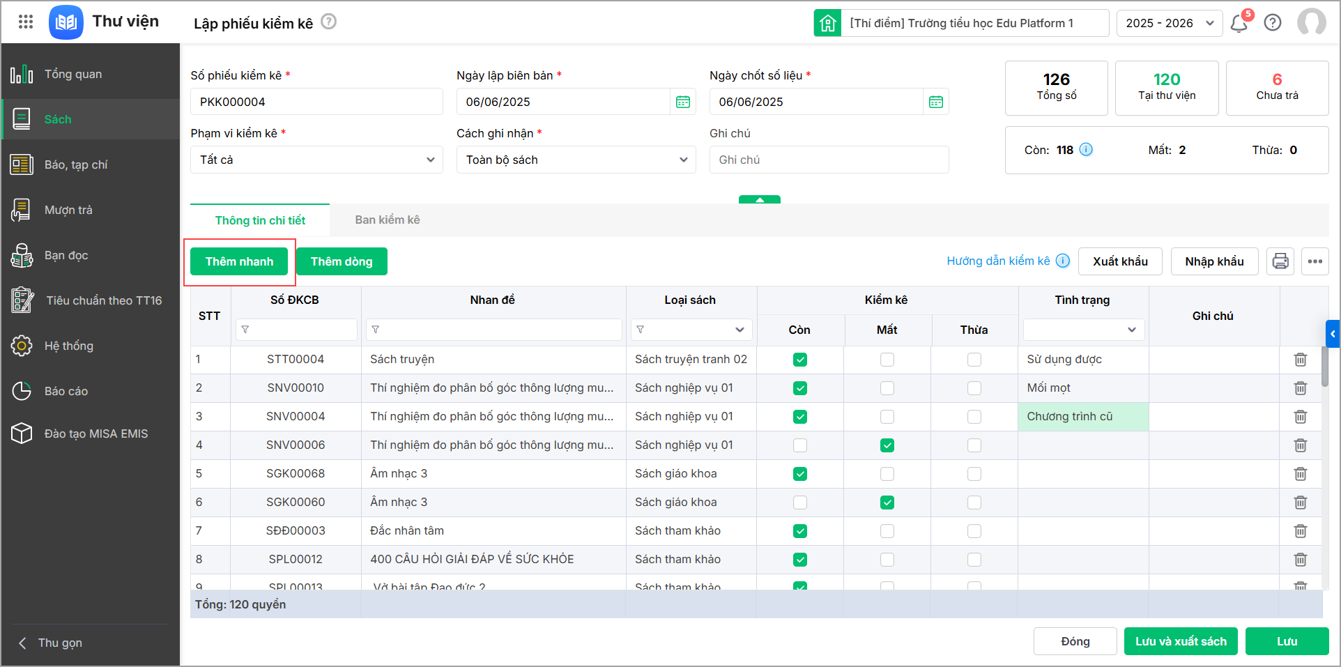 - Nếu sách thừa tức là sách chưa được khai báo tại thư viện nhưng kiểm kê lại có, cần khai báo bổ sung để thực hiện các nghiệp vụ mượn/trả sách liên quan.