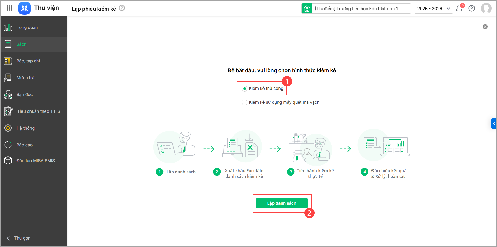 - Kiểm kê thủ công: Thực hiện khi cần kiểm kê ghi nhận bất thường hoặc kiểm kê toàn bộ sách bằng cách xuất khẩu toàn bộ danh sách để kiểm kê và nhập khẩu lại vào phần mềm.