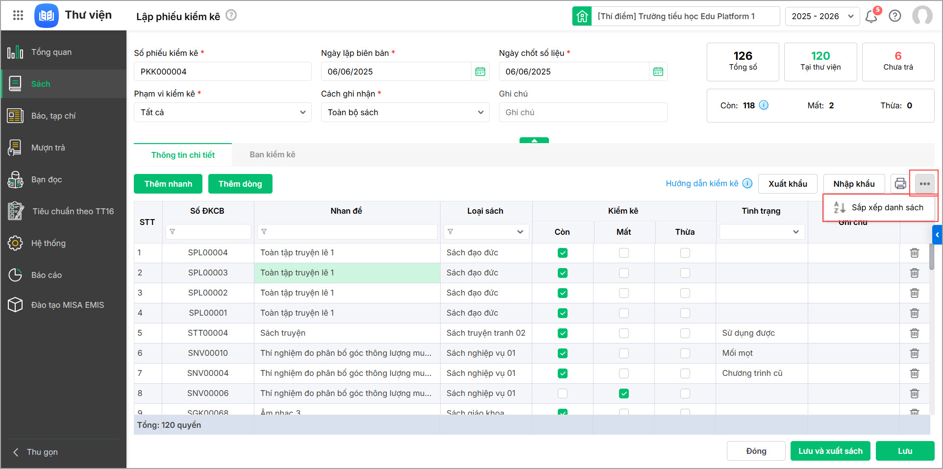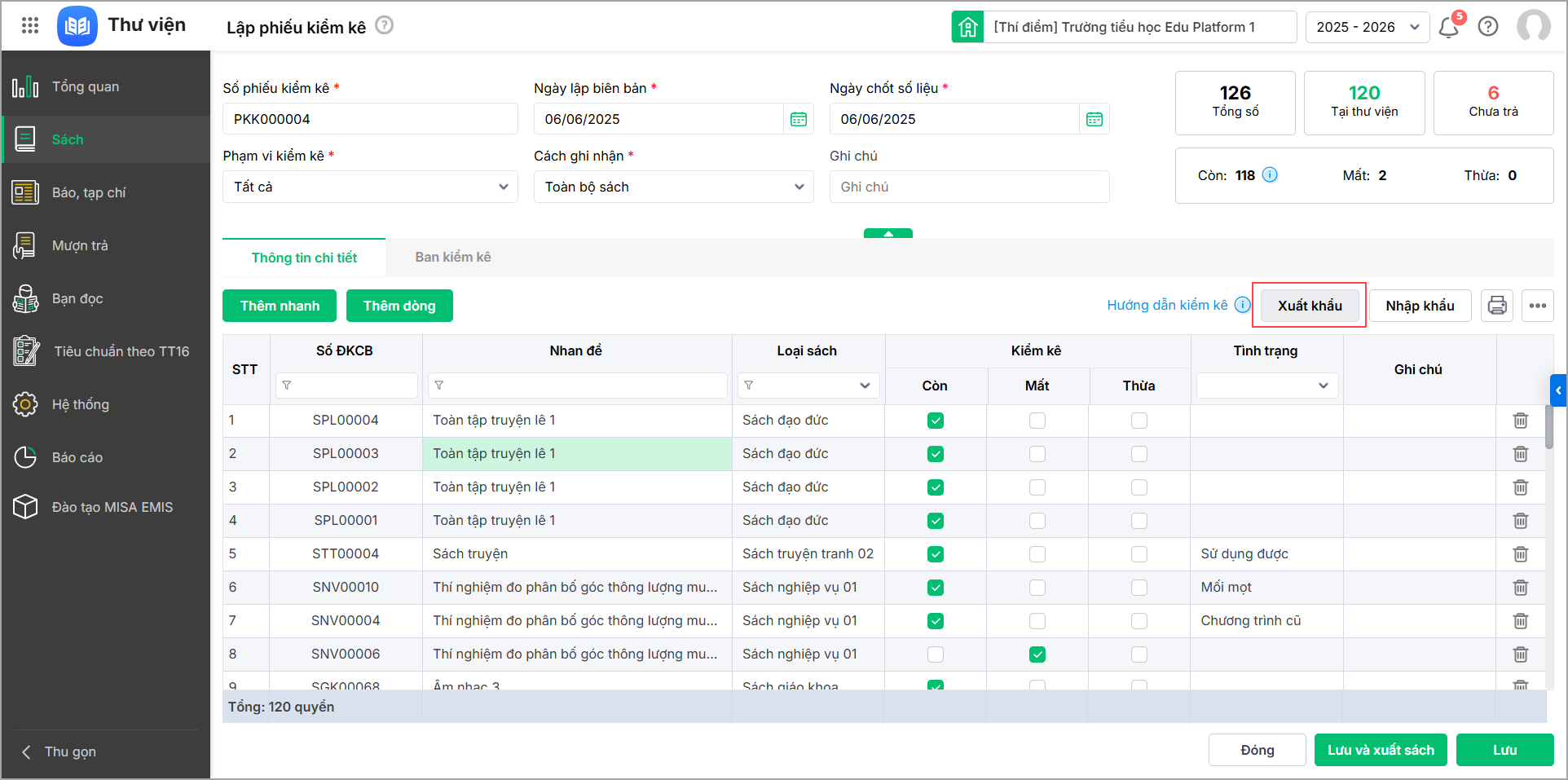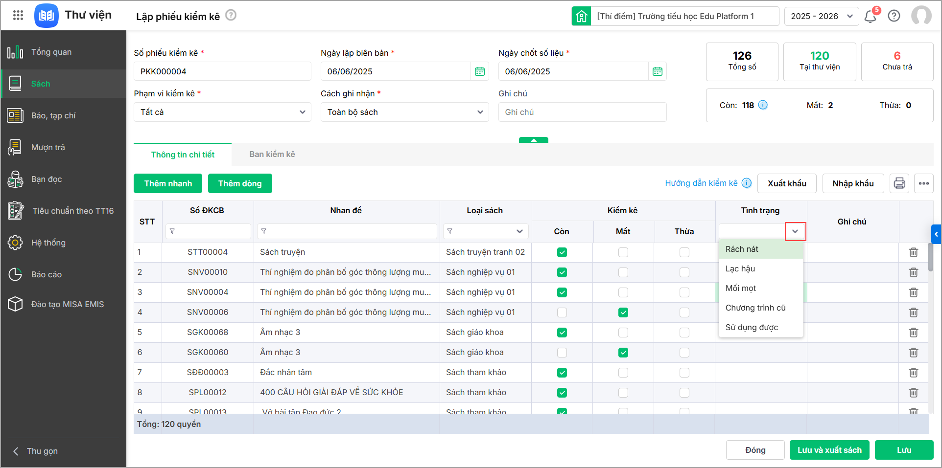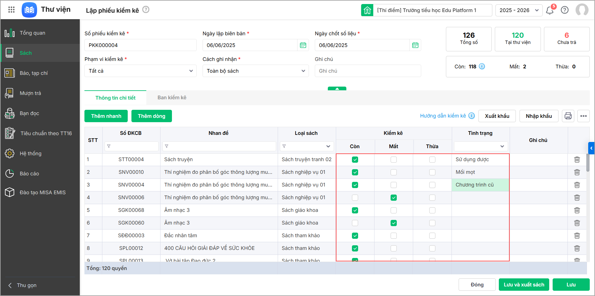 - Tích chọn tình trạng kiểm kê: Còn, Mất, Thừa tương ứng với từng sách