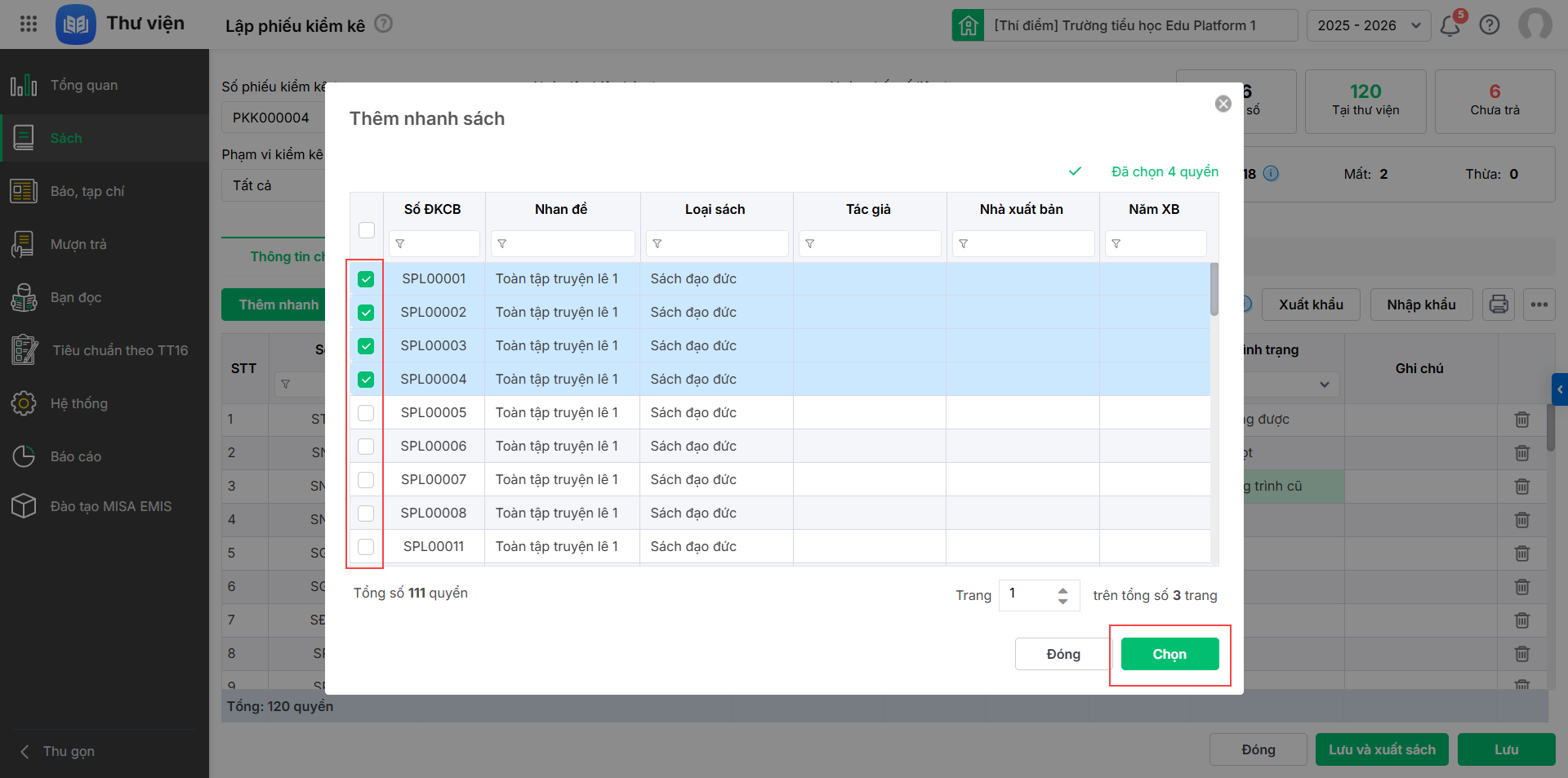 - Tích chọn sách cần tìm. Nhấn Chọn.