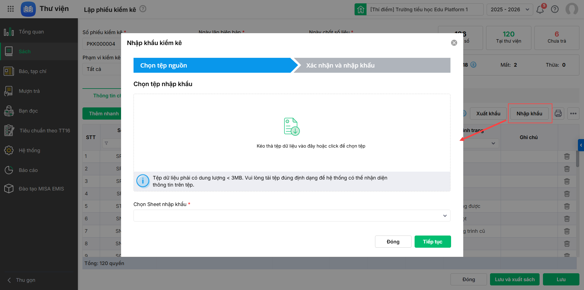- Nhấn Nhập khẩu. Tải tệp excel đã kiểm kê lên hệ thống. Nhấn Tiếp tục để chuyển sang bước Xác nhận và nhập khẩu.