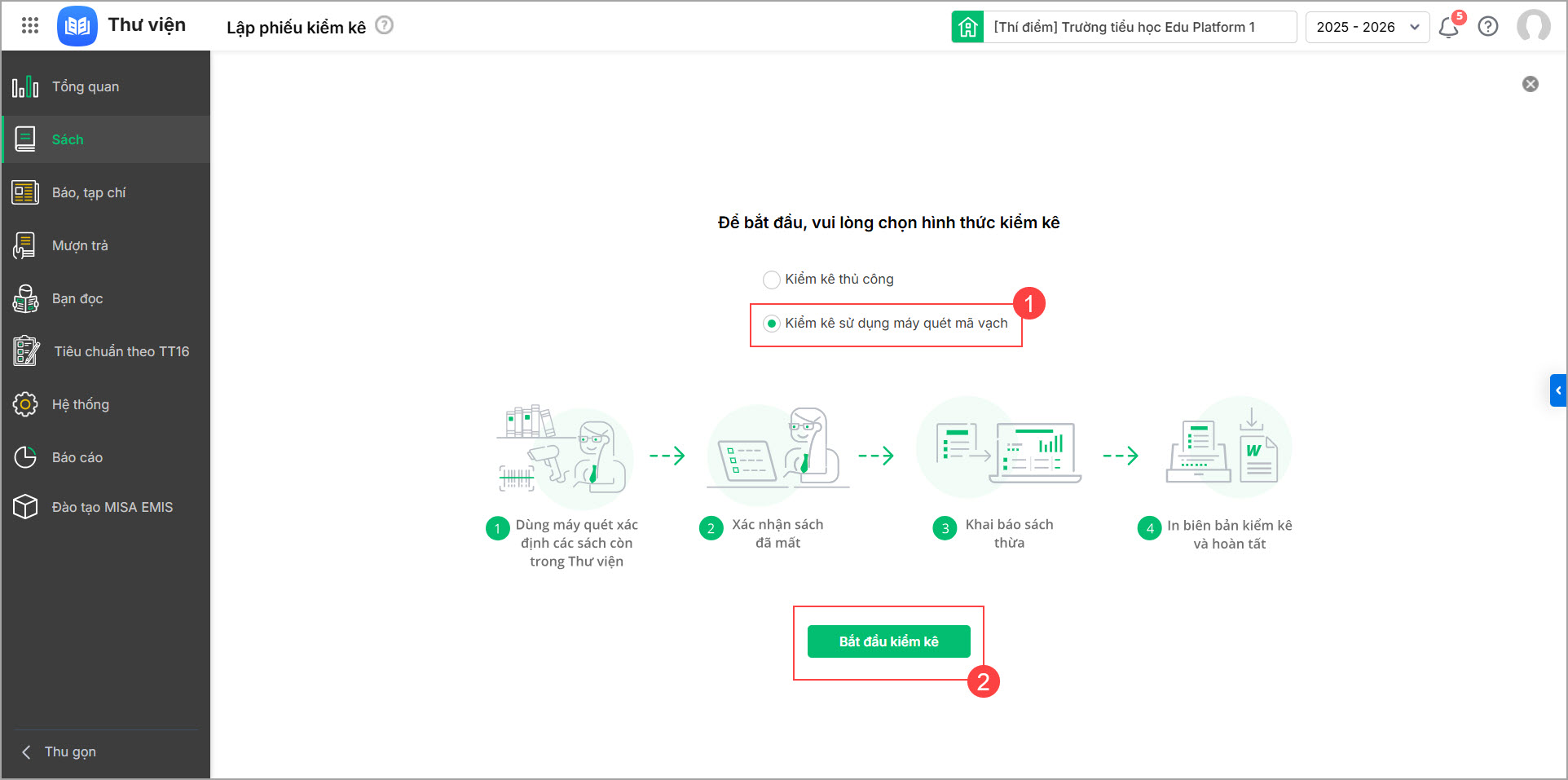 - Kiểm kê sử dụng máy quét mã vạch: Sử dụng máy quét mã vạch để kiểm kê toàn bộ sách trong thư viện.
