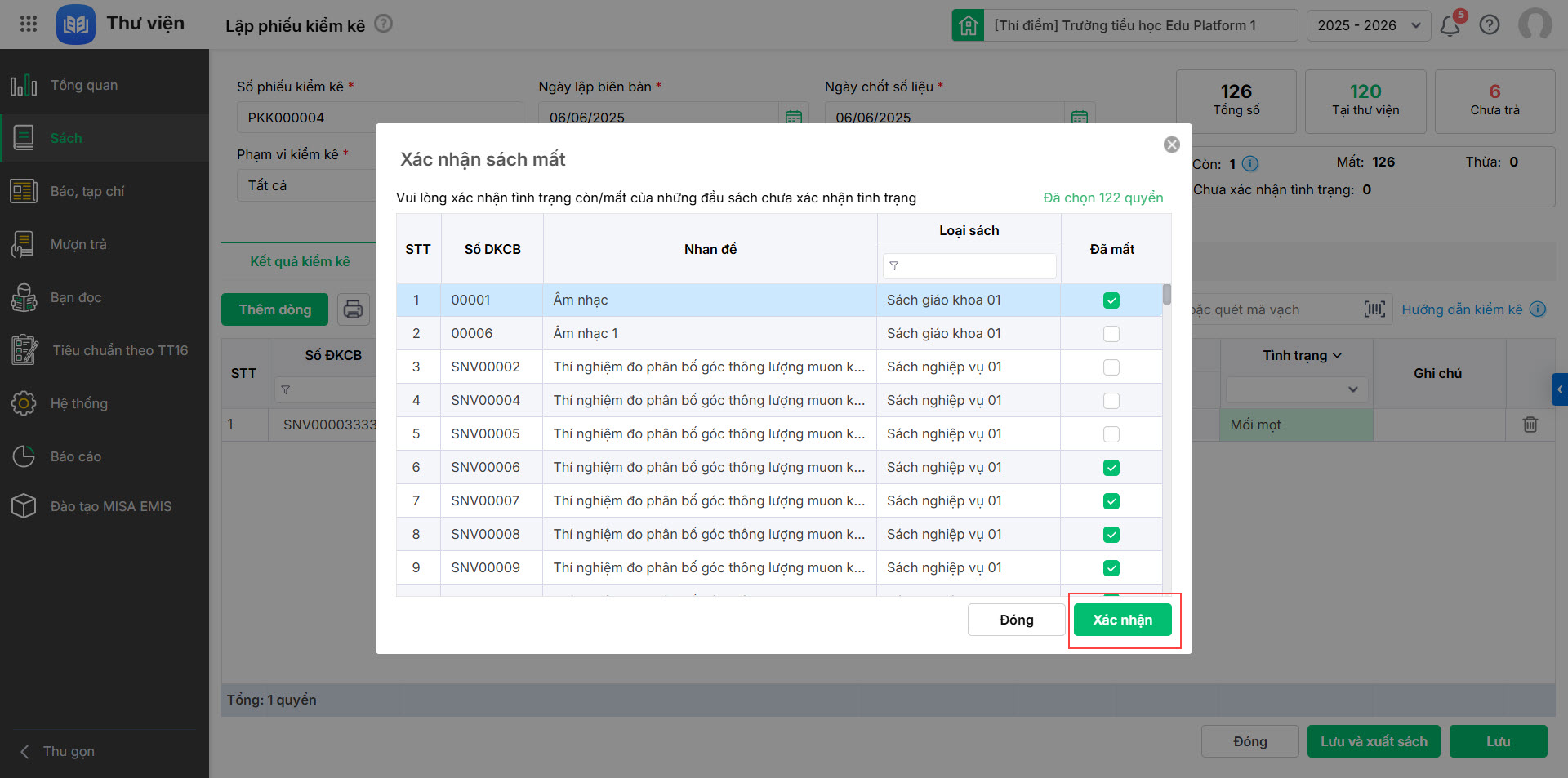 Sau khi hoàn thành quét mã vạch, hệ thống sẽ thống kê danh sách sách bị mất. CBTV cần xác nhận bằng cách: