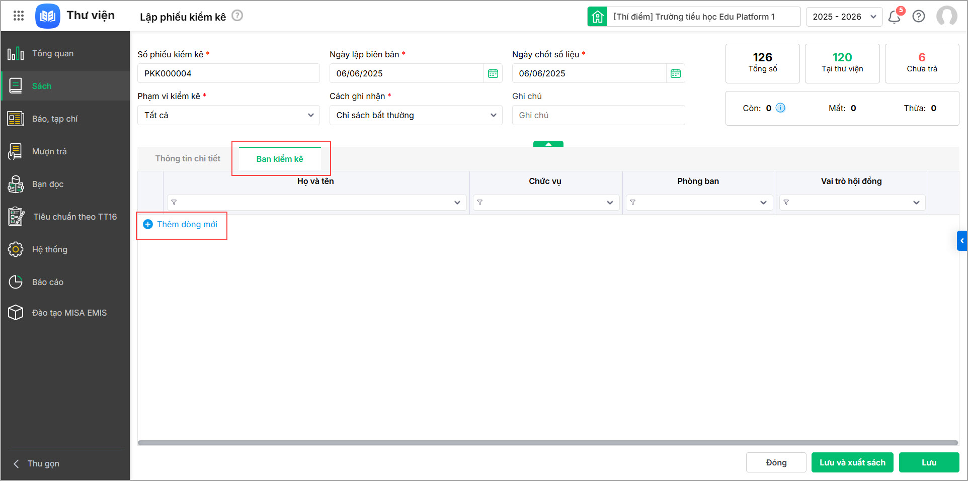 - Nhấn Thêm dòng mới để thêm sách vào danh sách kiểm kê