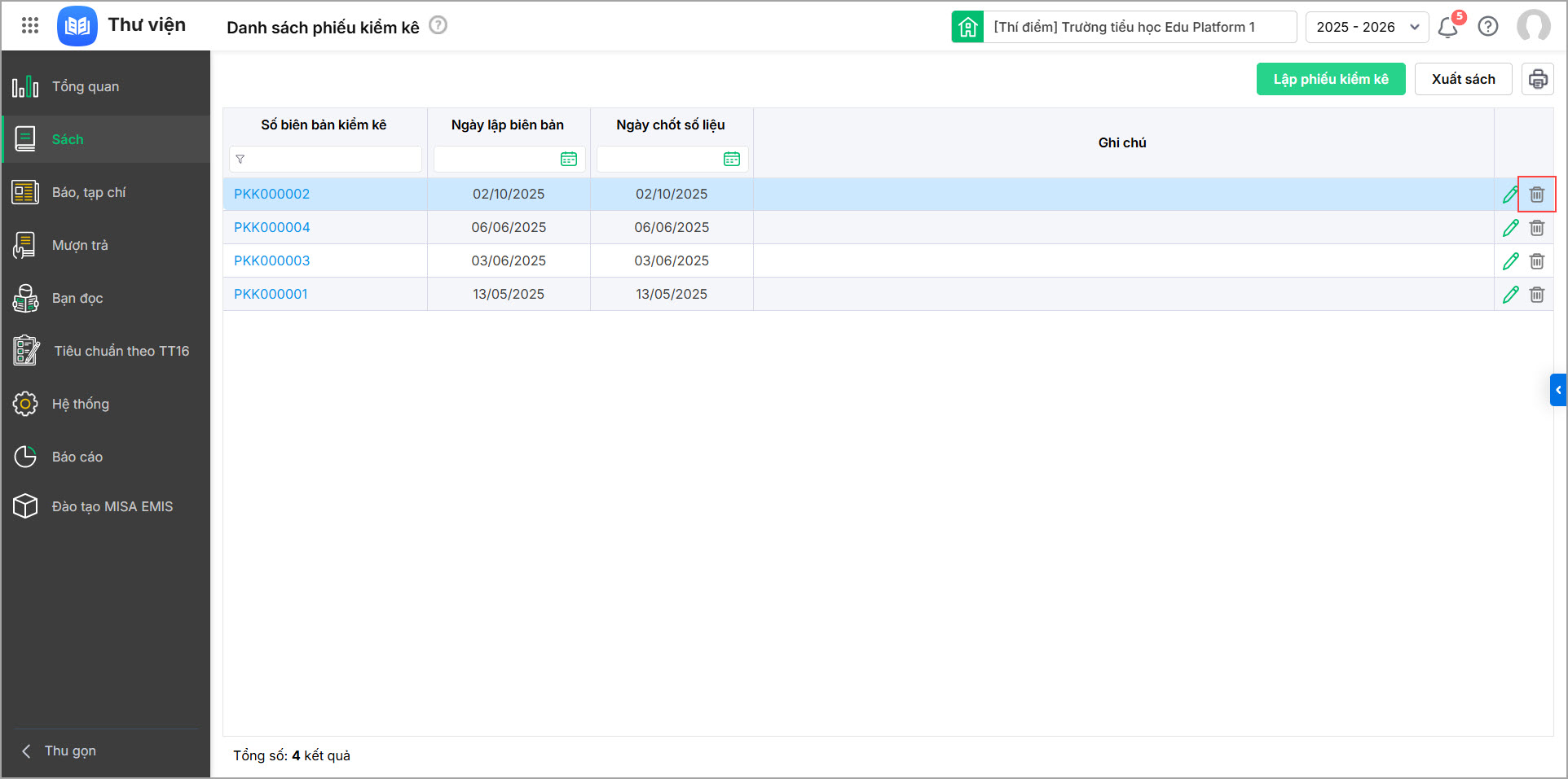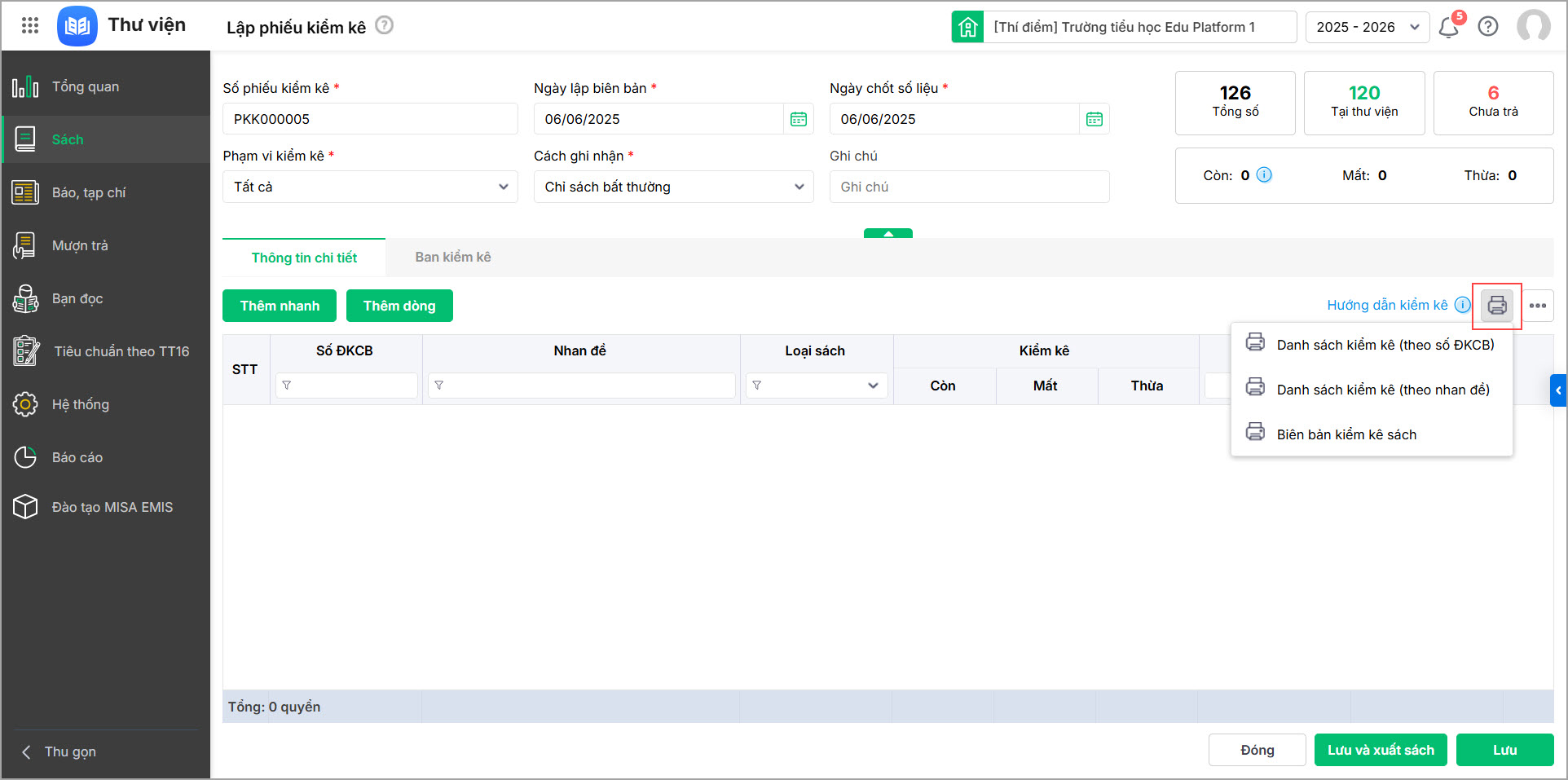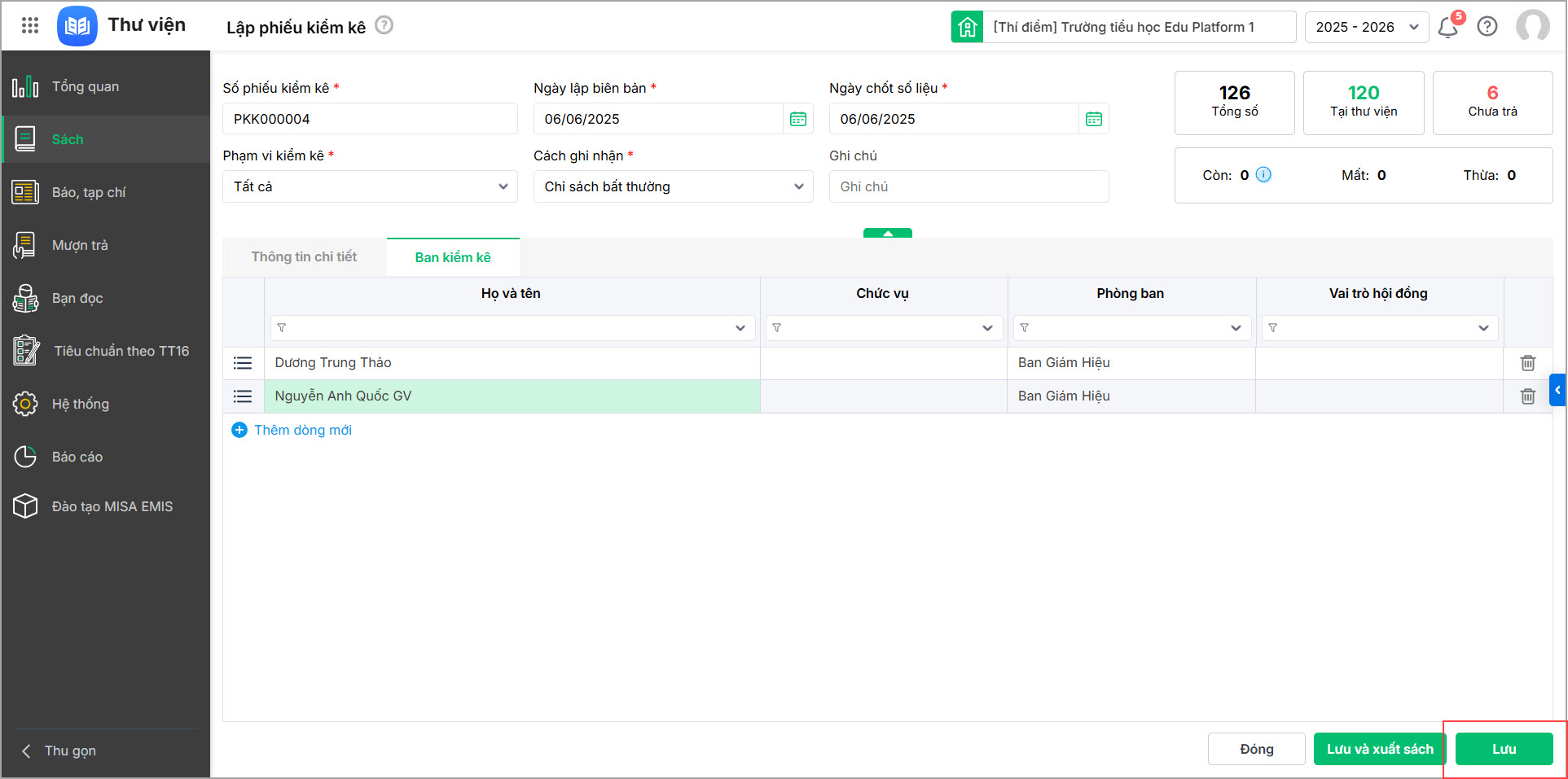 Khi nhấn Lưu và xuất sách, hệ thống tự động tạo phiếu xuất cho danh sách sách đã kiểm kê. Xem hướng dẫn xuất sách tại đây: