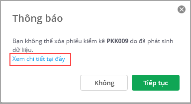 - Trường hợp không thể xóa phiếu kiểm kê do đã phát sinh dữ liệu liên quan, hệ thống hiện thị thông báo như dưới đây. Anh/chị nhấn Xem chi tiết tại đây để kiểm tra chứng từ phát sinh liên quan.