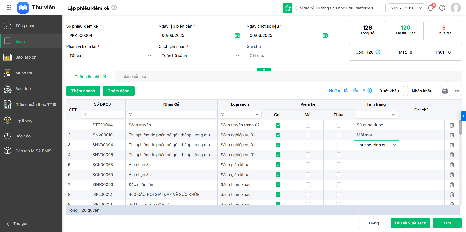 - Tích chọn tình trạng kiểm kê: Còn, Mất, Thừa tương ứng với từng sách
