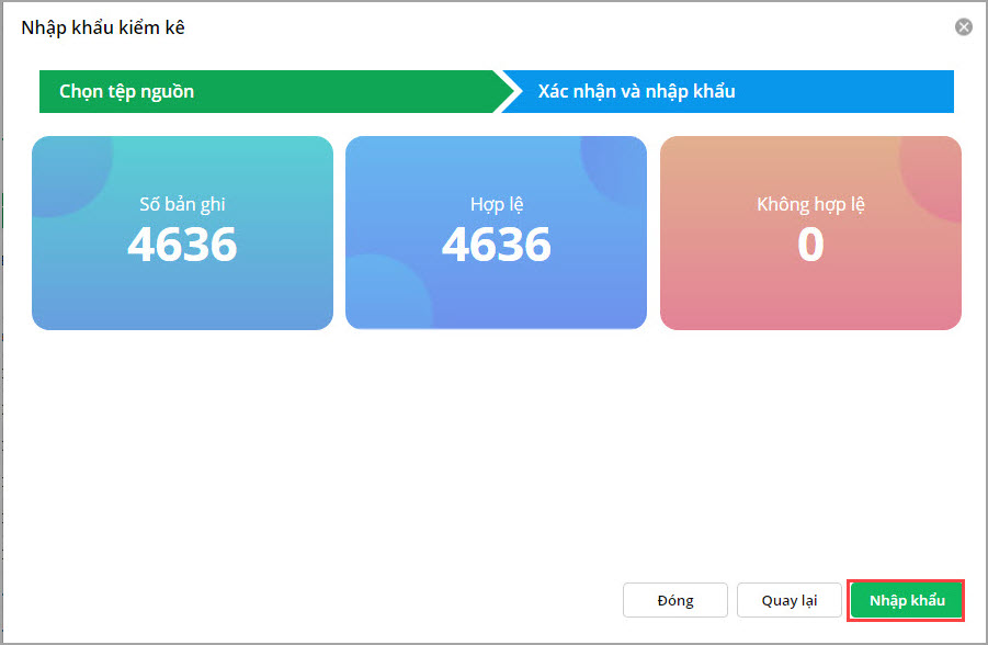 - Nhấn Nhập khẩu. Tải tệp excel đã kiểm kê lên hệ thống. Nhấn Tiếp tục để chuyển sang bước Xác nhận và nhập khẩu.