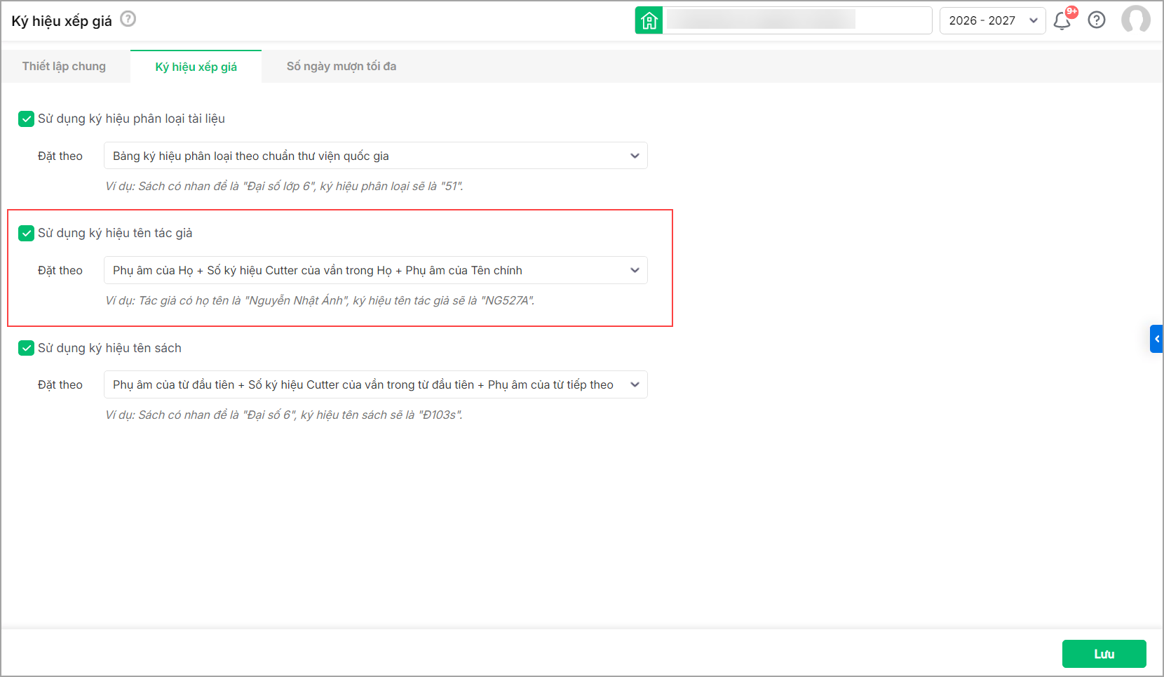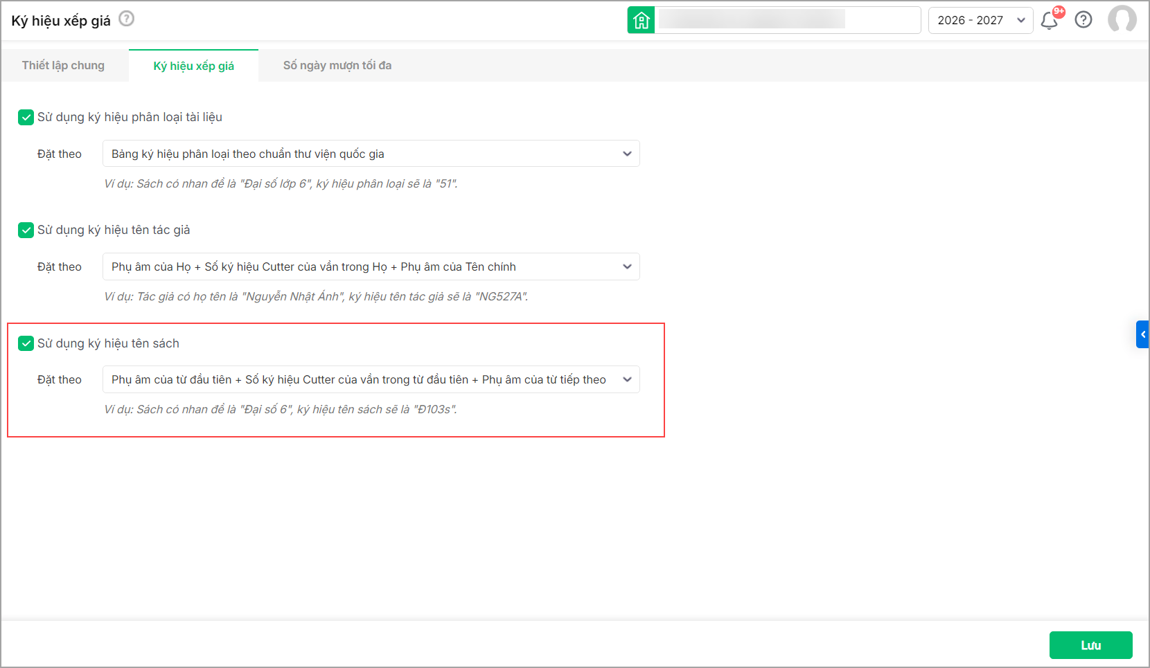 Nếu tích chọn Sử dụng ký hiệu tên sách, CBTV có thể chọn 1 trong các hình thức đặt ký hiệu như sau: