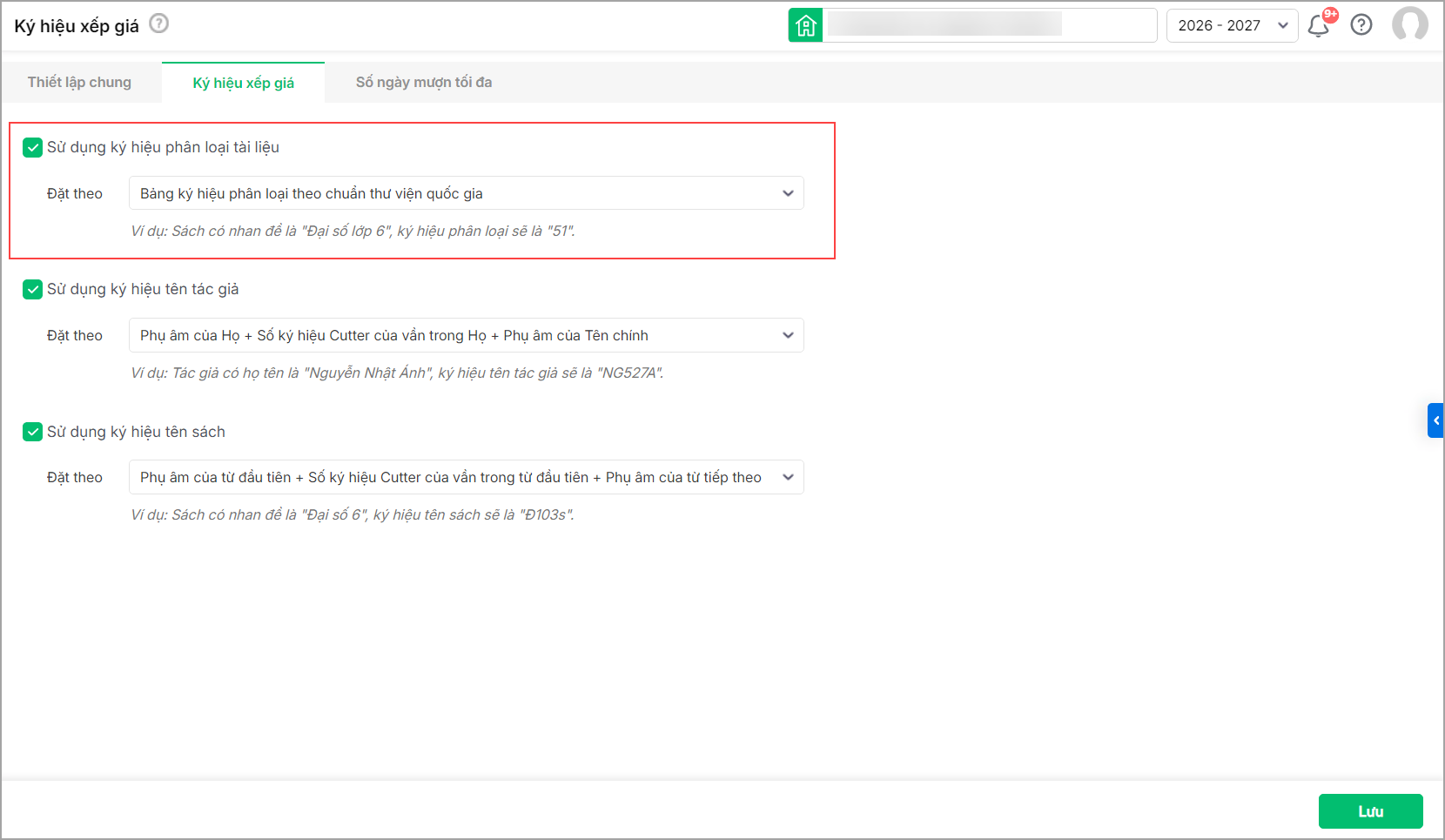 Nếu tích chọn Sử dụng ký hiệu phân loại tài liệu, CBTV có thể sử dụng 1 trong 2 Bảng KHPL có sẵn do Hệ thống cung cấp:- Bảng KHPL theo chuẩn thư viện quốc gia