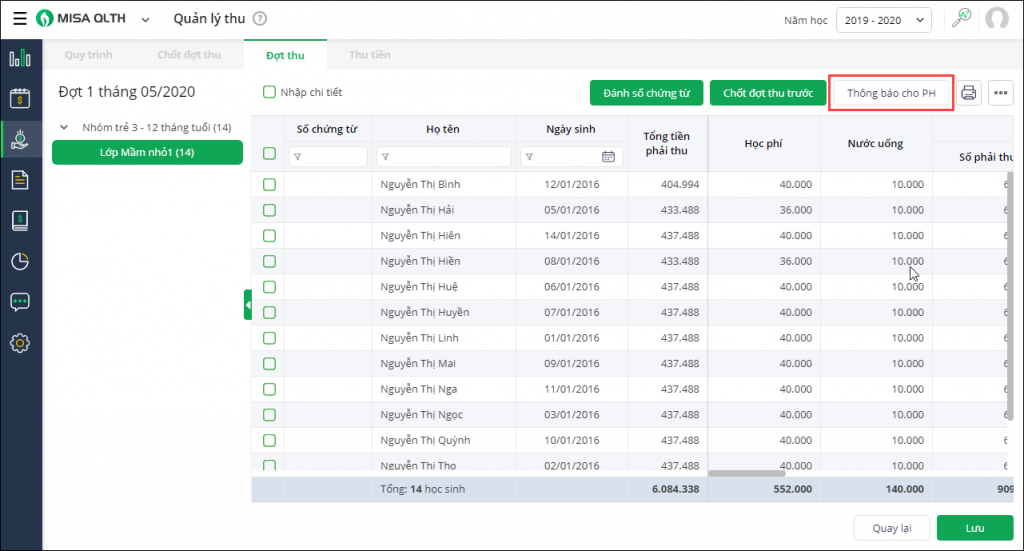 - Nhấn Thông báo cho PH hoặc nhấn vào biểu tượng “mũi tên màu xanh” tại học sinh để thông báo nộp tiền cho phụ huynh qua ứng dụng SISAP mobile hoặc SMS