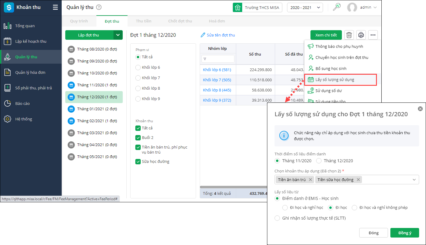 - Từ phiên bản R111: Khi lấy kết quả điểm danh từ phân hệ học sinh, cho phép kế toán chọn lấy tất cả hay chỉ lấy học sinh nghỉ có phép/không phép.