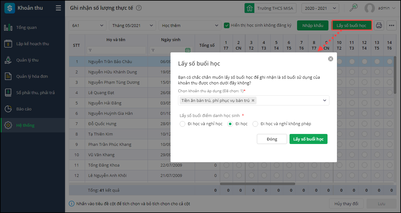 - Trước phiên bản R111: Cuối tháng, kế toán vào phân hệ khoản thu/ hệ thống/ ghi nhận số lượng thực tế/ lấy số buổi học từ phân hệ học sinh. Tuy nhiên chưa lấy riêng được các buổi học sinh nghỉ có phép, kế toán phải tự tổng hợp. Việc này kế toán mất thời gian thực hiện.