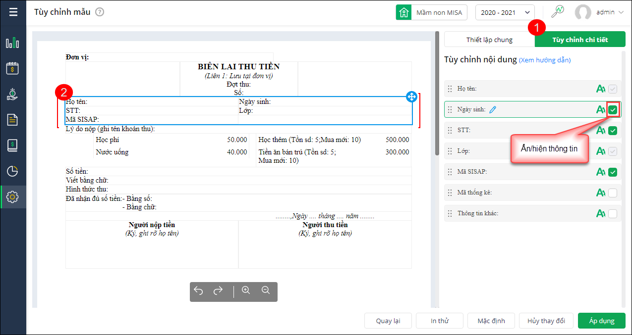 4. Tại phần Tùy chỉnh chi tiết\vùng thông tin học sinh, anh/chị tích chọn/bỏ tích chọn tại thông tin ngày sinh để hiện/ẩn thông tin này trên thông báo, chứng từ thu tiền.